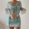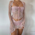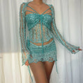 Ensemble deux pièces sexy en crochet tricoté avec jupe, haut court à paillettes et mini-jupe, tenue élégante et ajourée pour femme
