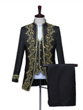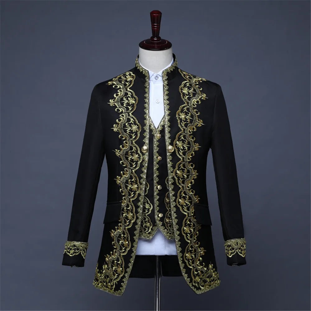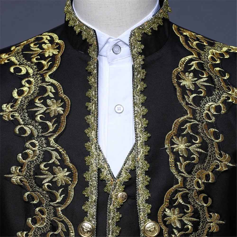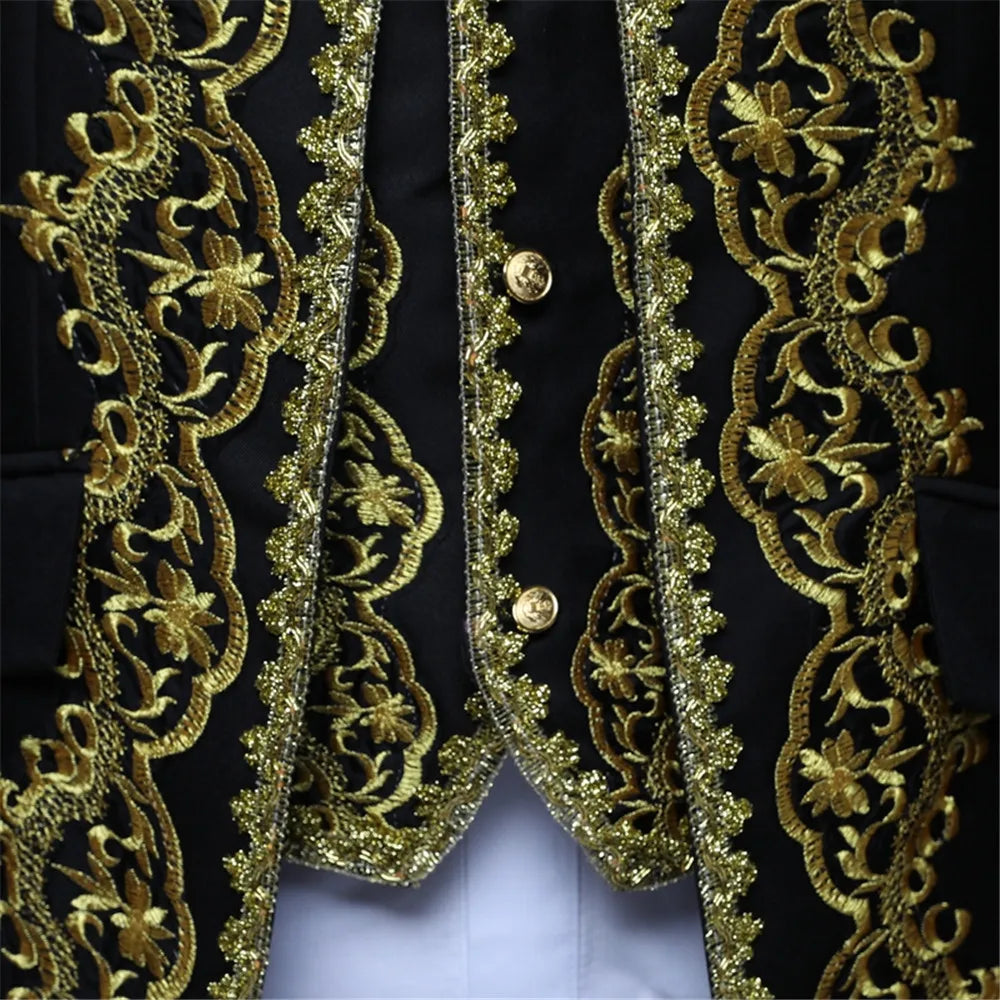 Costume 3 pièces vintage pour homme, veste de soirée élégante, noire et dorée, avec appliques, pour théâtre et gala
