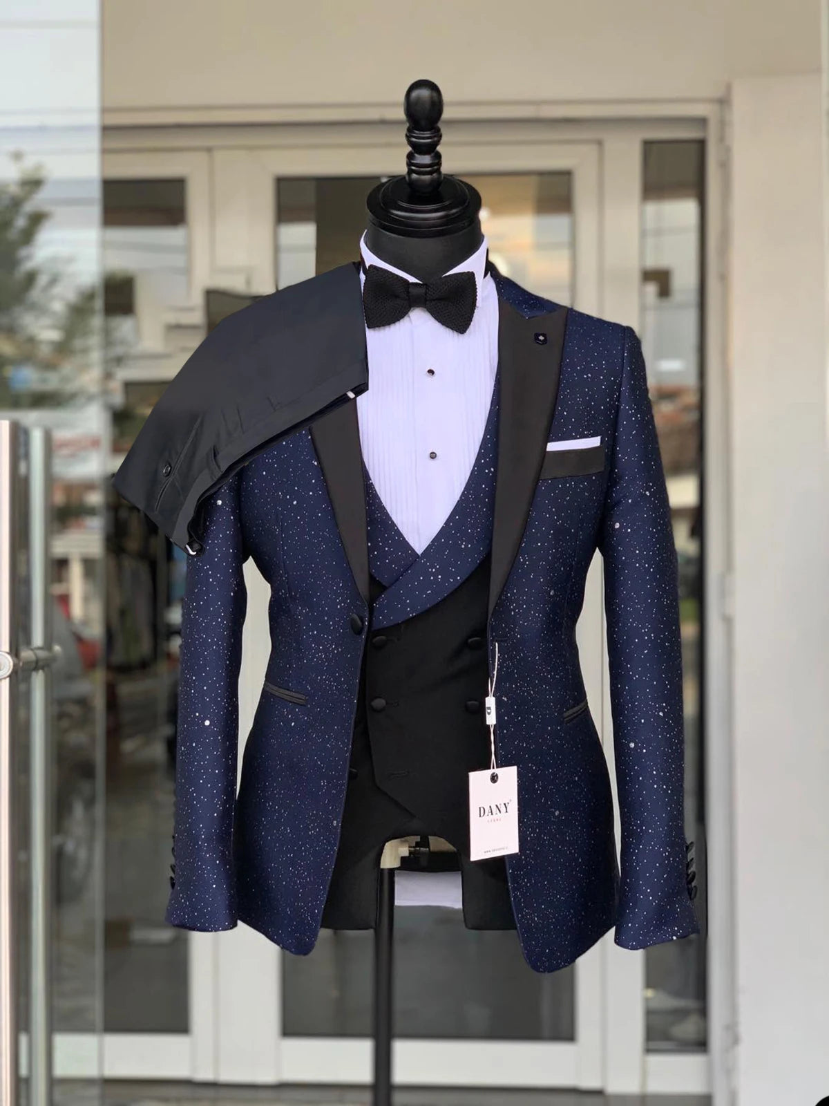 Costume de smoking de mariage élégant pour homme avec tissu scintillant, revers pointus, un bouton, manteau, gilet et pantalon personnalisables pour les occasions formelles