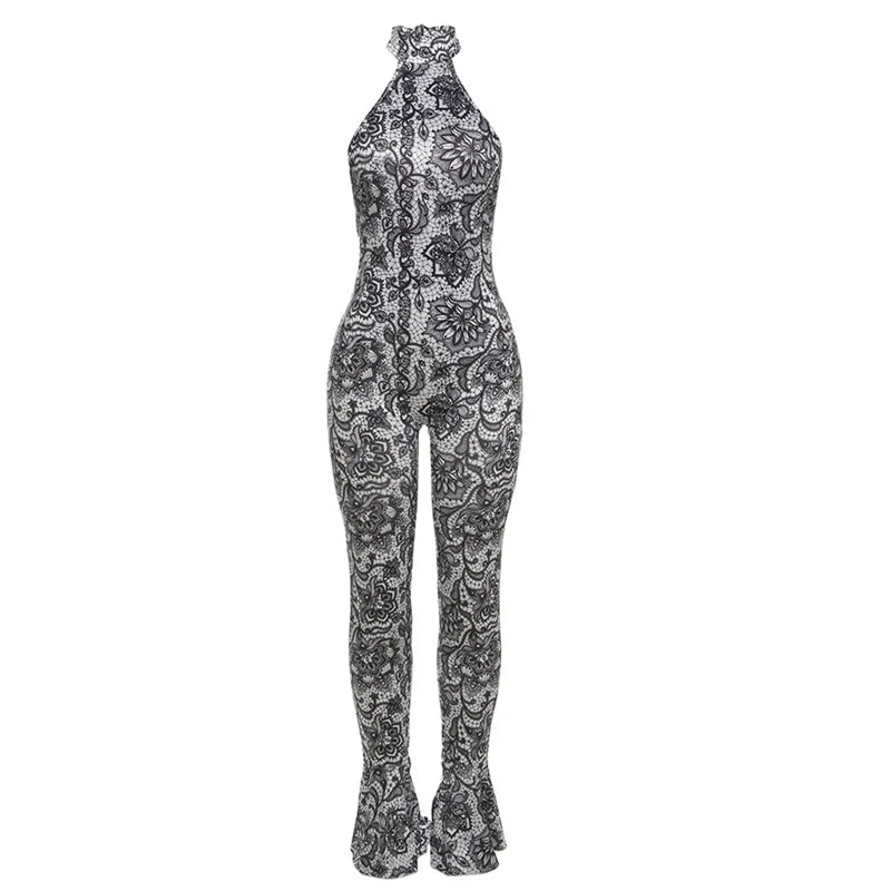 Show off your curves in this sexy peach buttocks jumpsuit for women, designed for summer nights and standout streetwear style. Featuring a flattering backless and sleeveless cut, this tight-fitting overall is adorned with artistic arabesque patterns and crafted from a stretchy midnight-hued fabric for ultimate comfort. Perfect for parties, nightlife, or turning heads wherever you go.