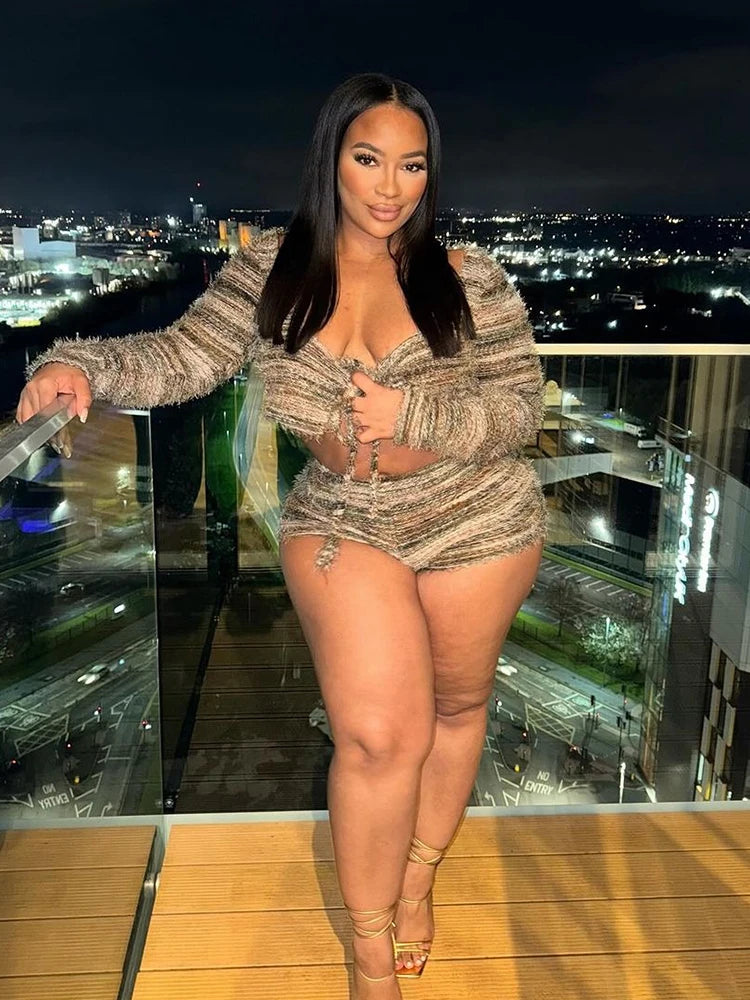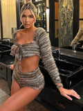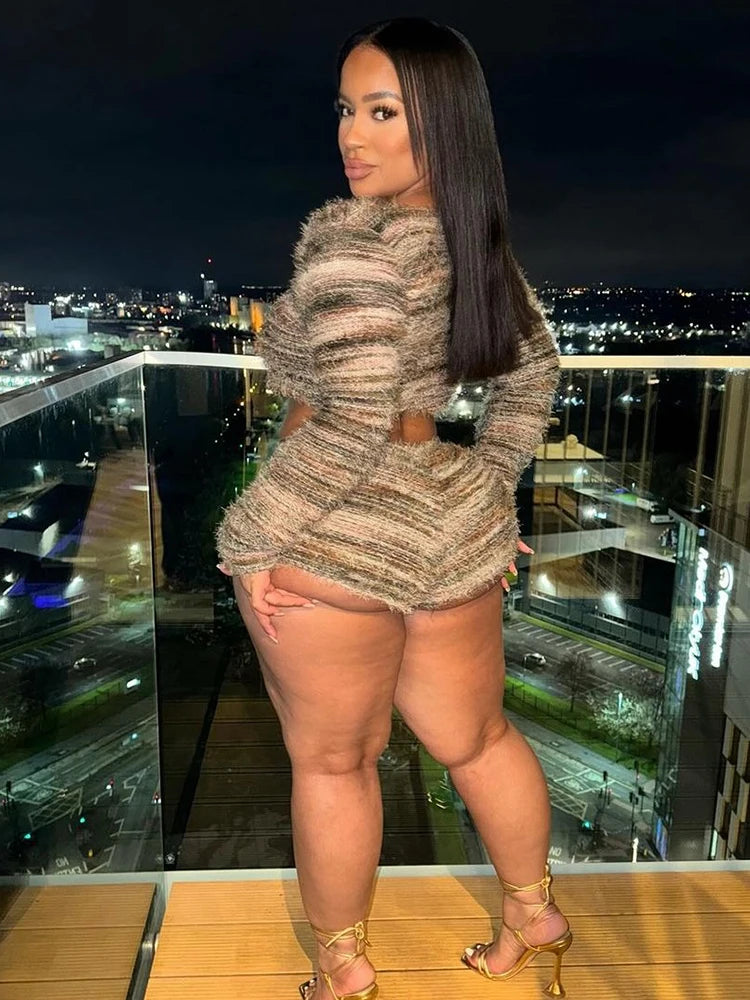 Ajoutez une touche de confort à votre garde-robe d'automne avec cet ensemble 2 pièces en tricot rayé pour femme. Composé d'un haut court en dentelle douce et duveteuse et d'un short extensible assorti, cet ensemble allie confort et style hipster tendance. Ses rayures ludiques et sa texture moelleuse créent un look décontracté et accrocheur, idéal pour le streetwear, la détente ou les sorties quotidiennes. Adoptez style et chaleur sans effort avec cet ensemble assorti indispensable de la saison.
