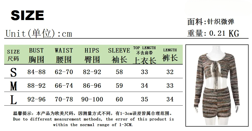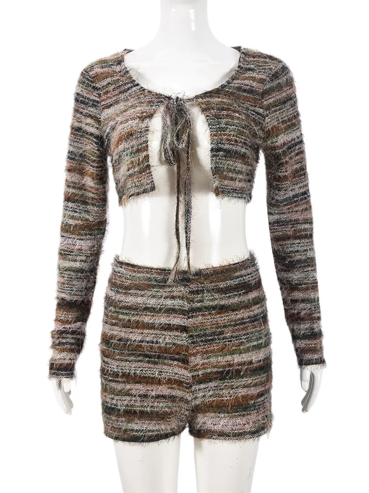 Ensemble 2 pièces en tricot à rayures pour femme, haut court et short en dentelle douce et duveteuse, extensible, assorti, style hipster, décontracté, pour l'automne