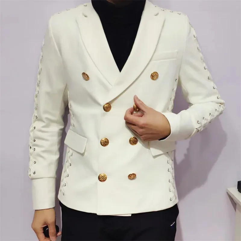 Blazer croisé blanc pour homme avec boutons dorés et détails de manches à lacets