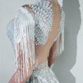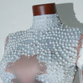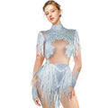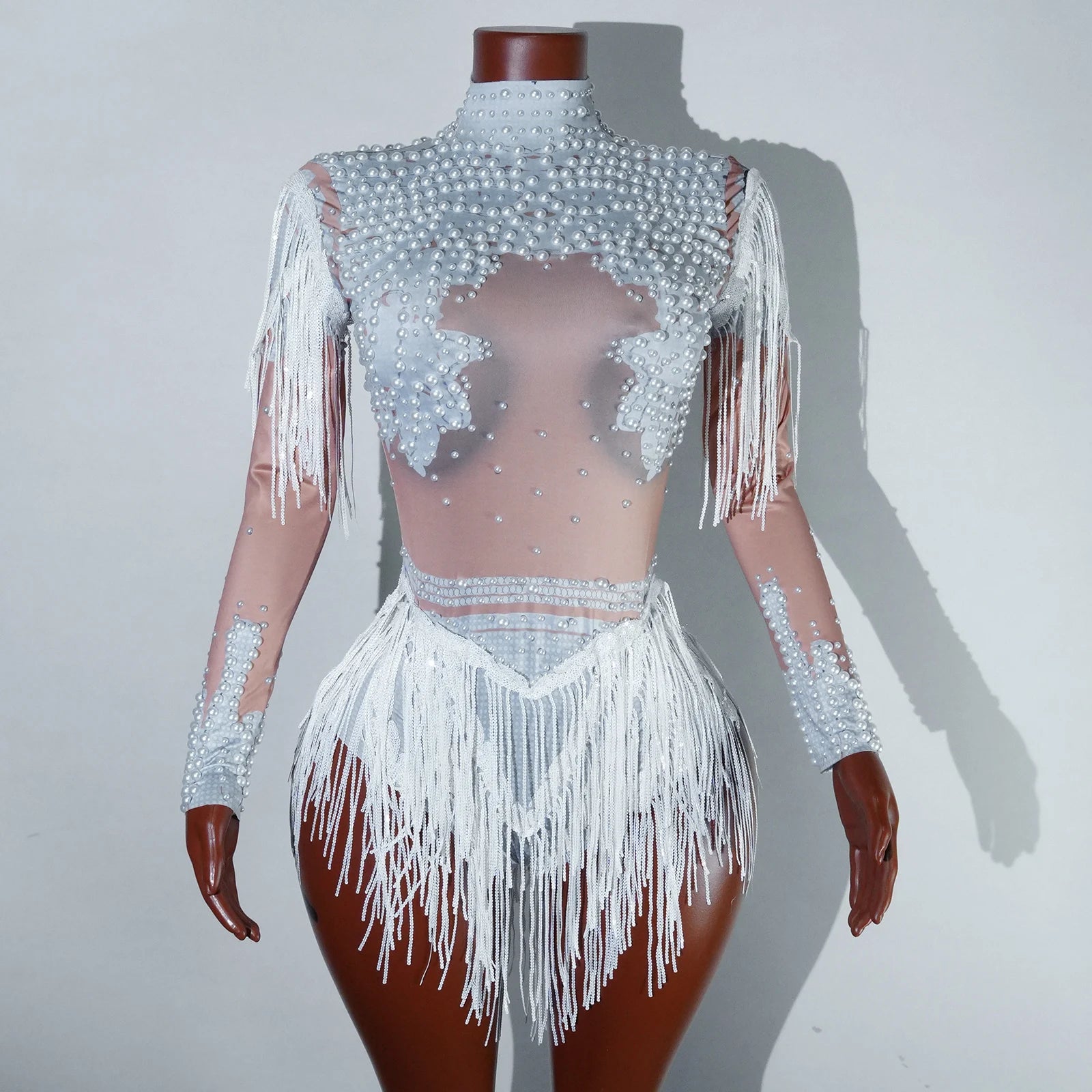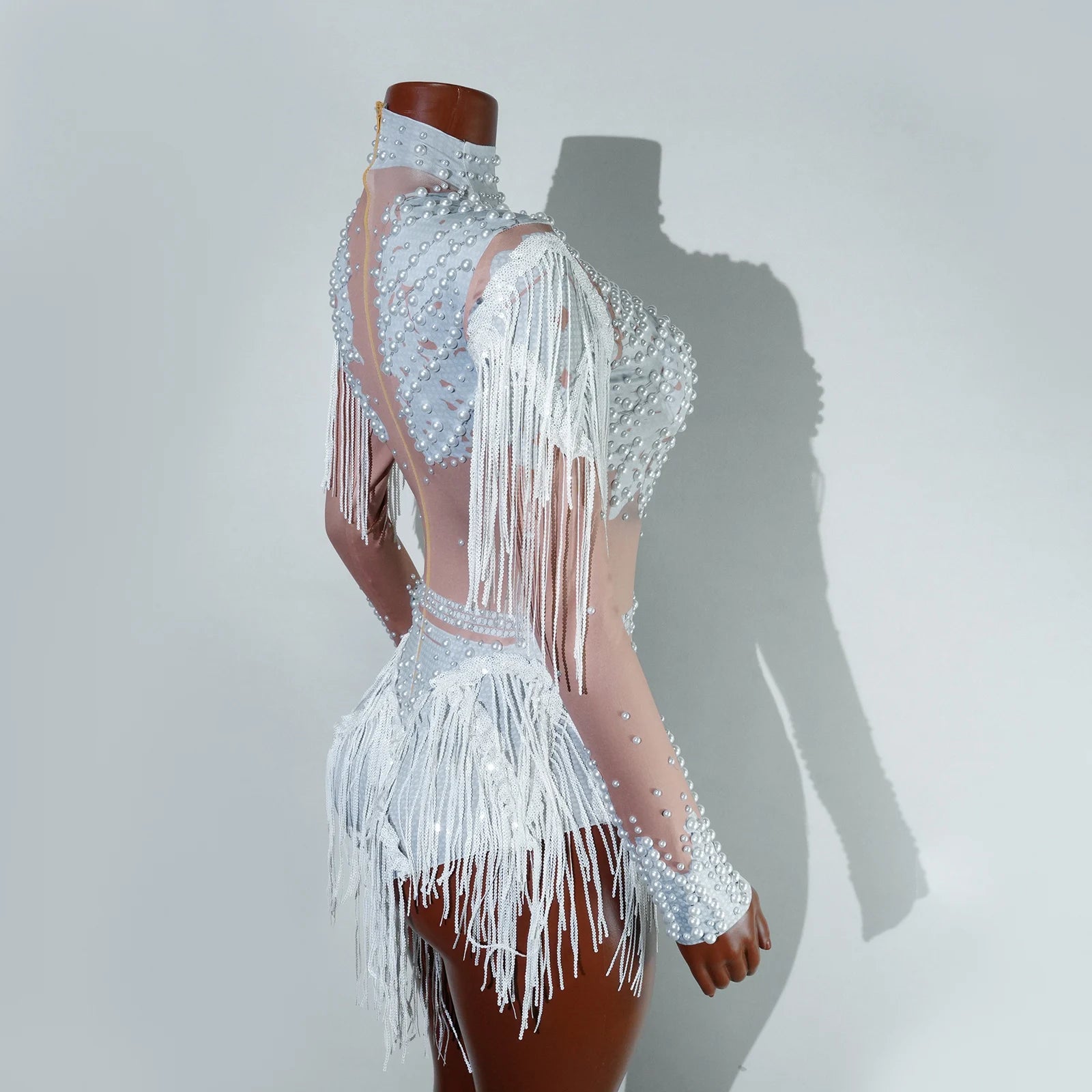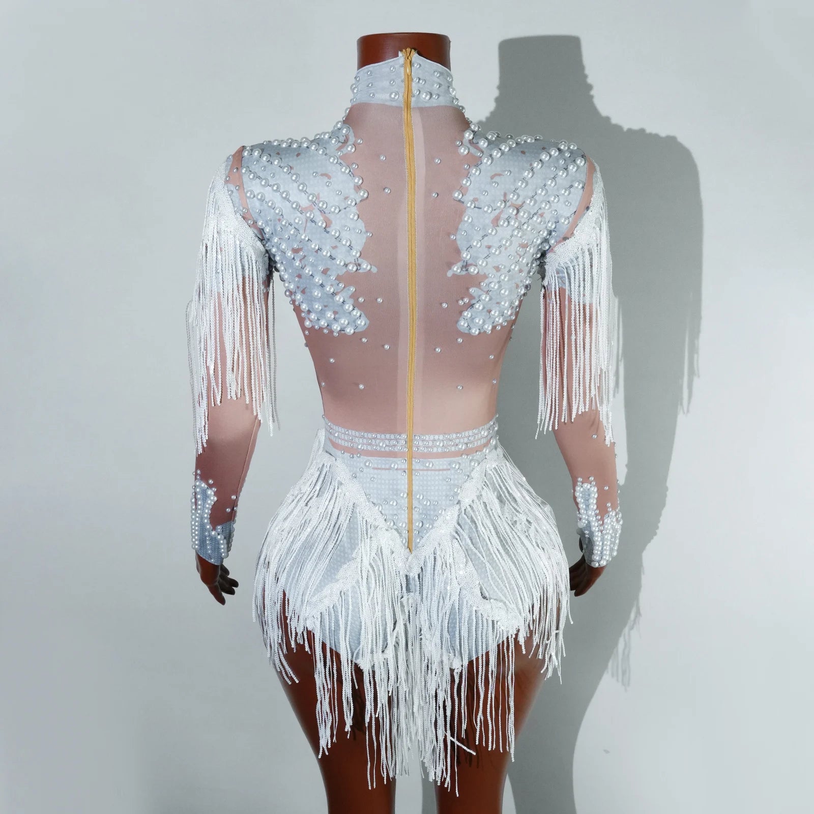 Body à franges en perles blanches, justaucorps de danse en boîte de nuit, tenue de chanteur sur scène, tenue de soirée, tenue de drag queen