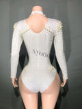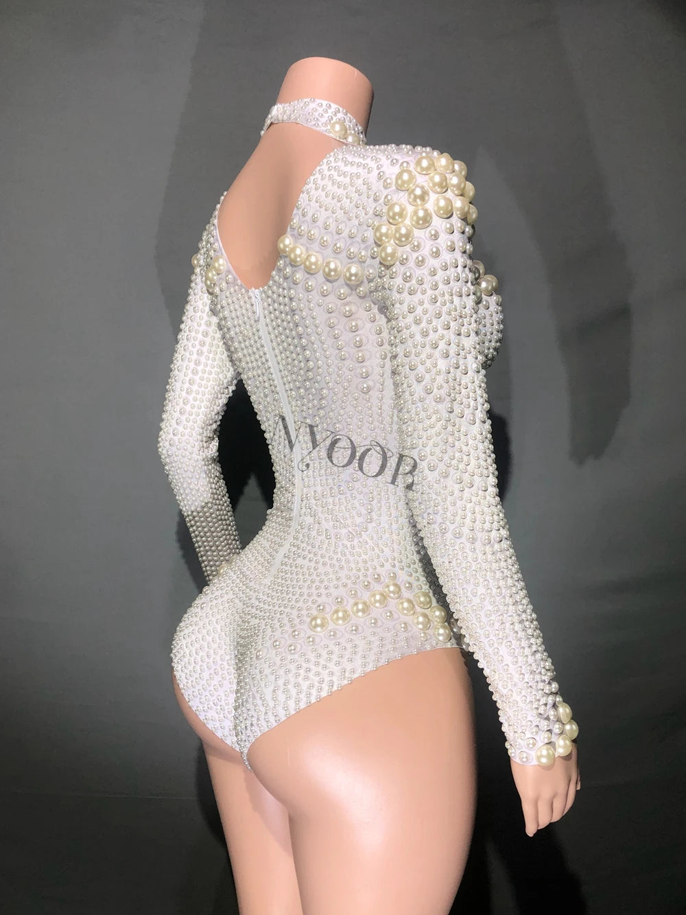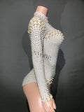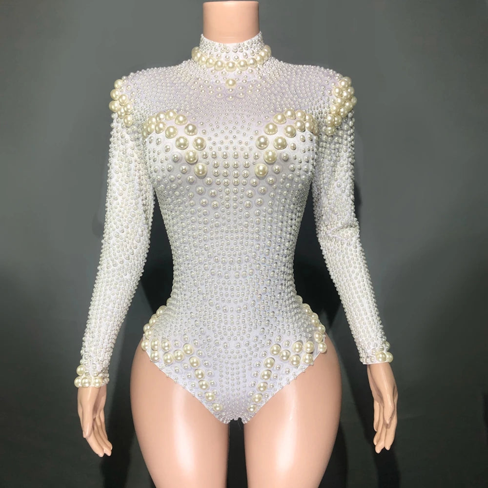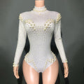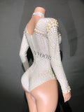 White Pearls Leotard Sexy Long Sleeve Bodysuit Nightclub Dance Outfit Singer Dancer Stage Wear Show Performance Costume