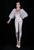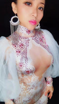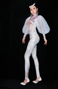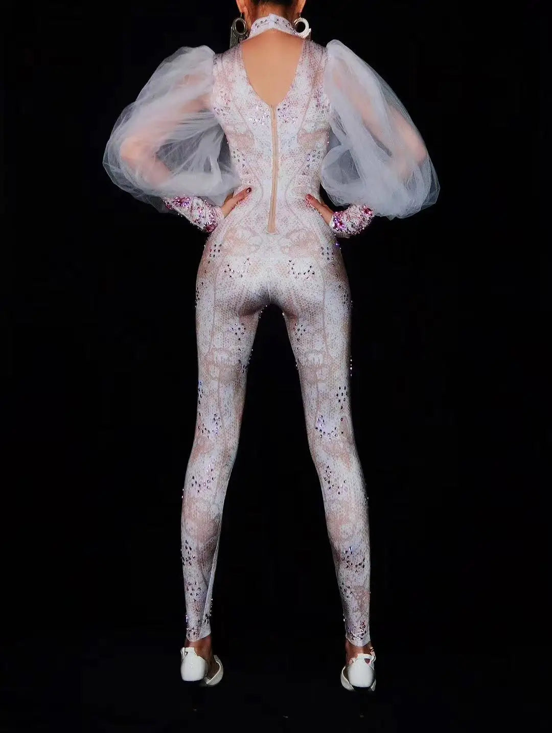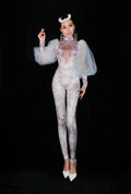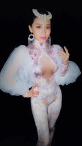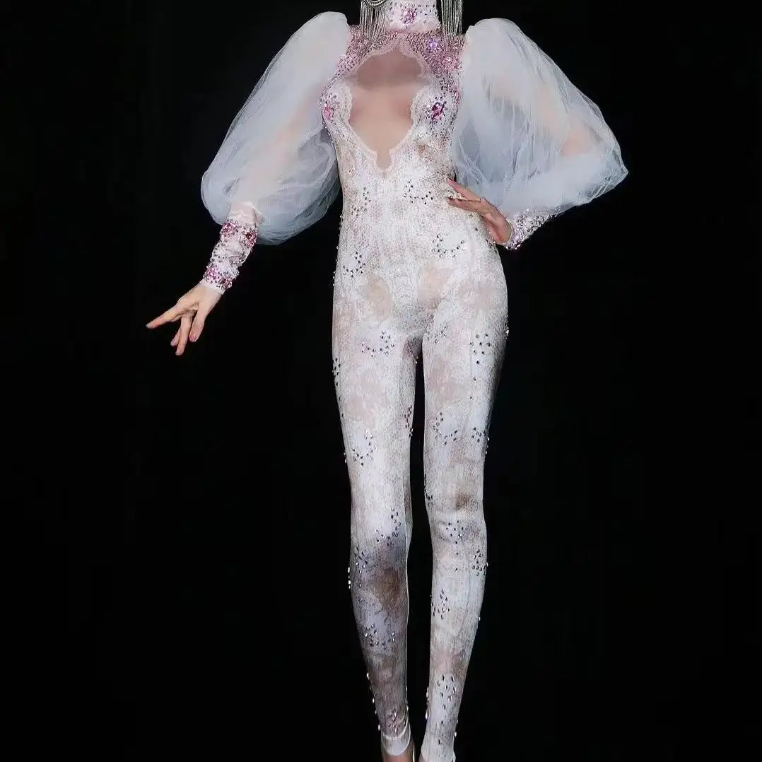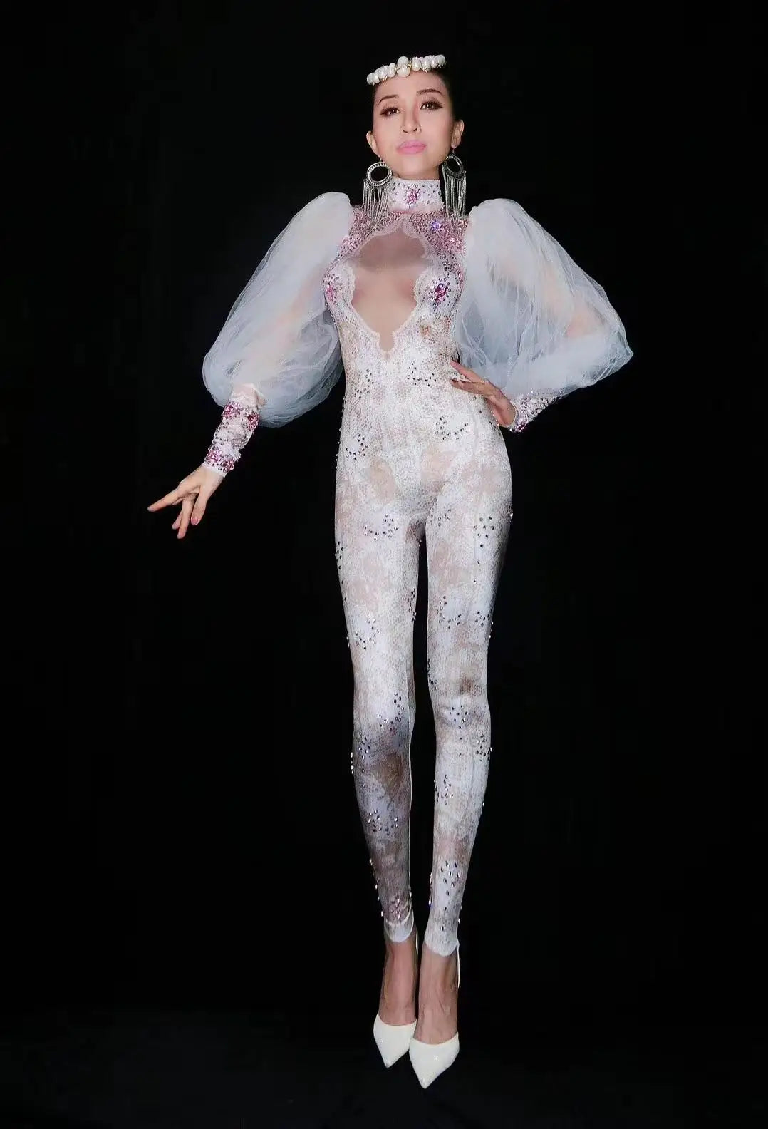 Woman Birthday Party Festival Wear Fashion White Lace Puff Sleeve Rompers Dancer Sexy Bodysuit Tight Fitting Rhinestone Jumpsuit
