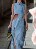 Women Denim Dress Fashion High Waist Hollow Out Long Party Dress Sexy Cutout Sleeveless Thigh Stand Collar Slit Maxi Dresses