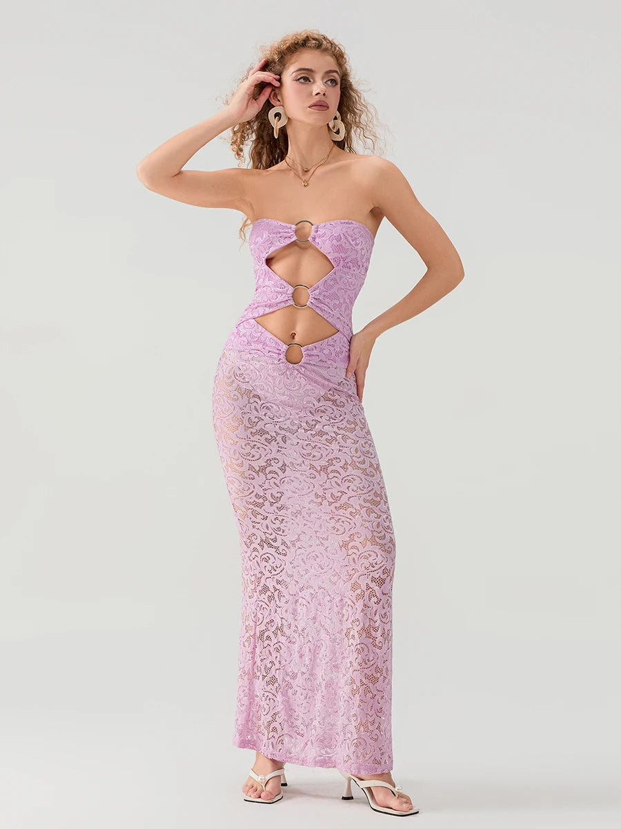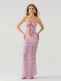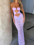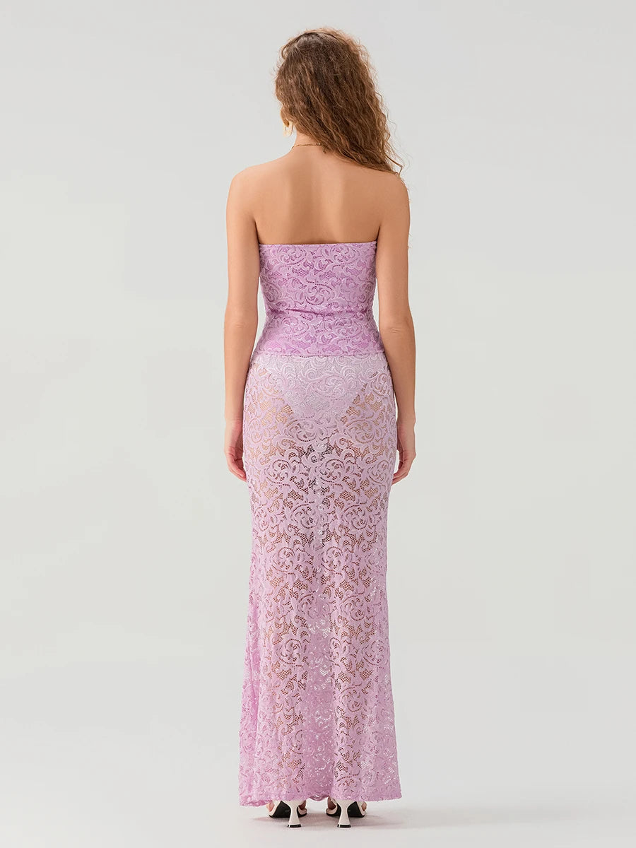 Robe en dentelle pour femme, sans bretelles, dos nu, ajourée, transparente, longue, robe de cocktail
