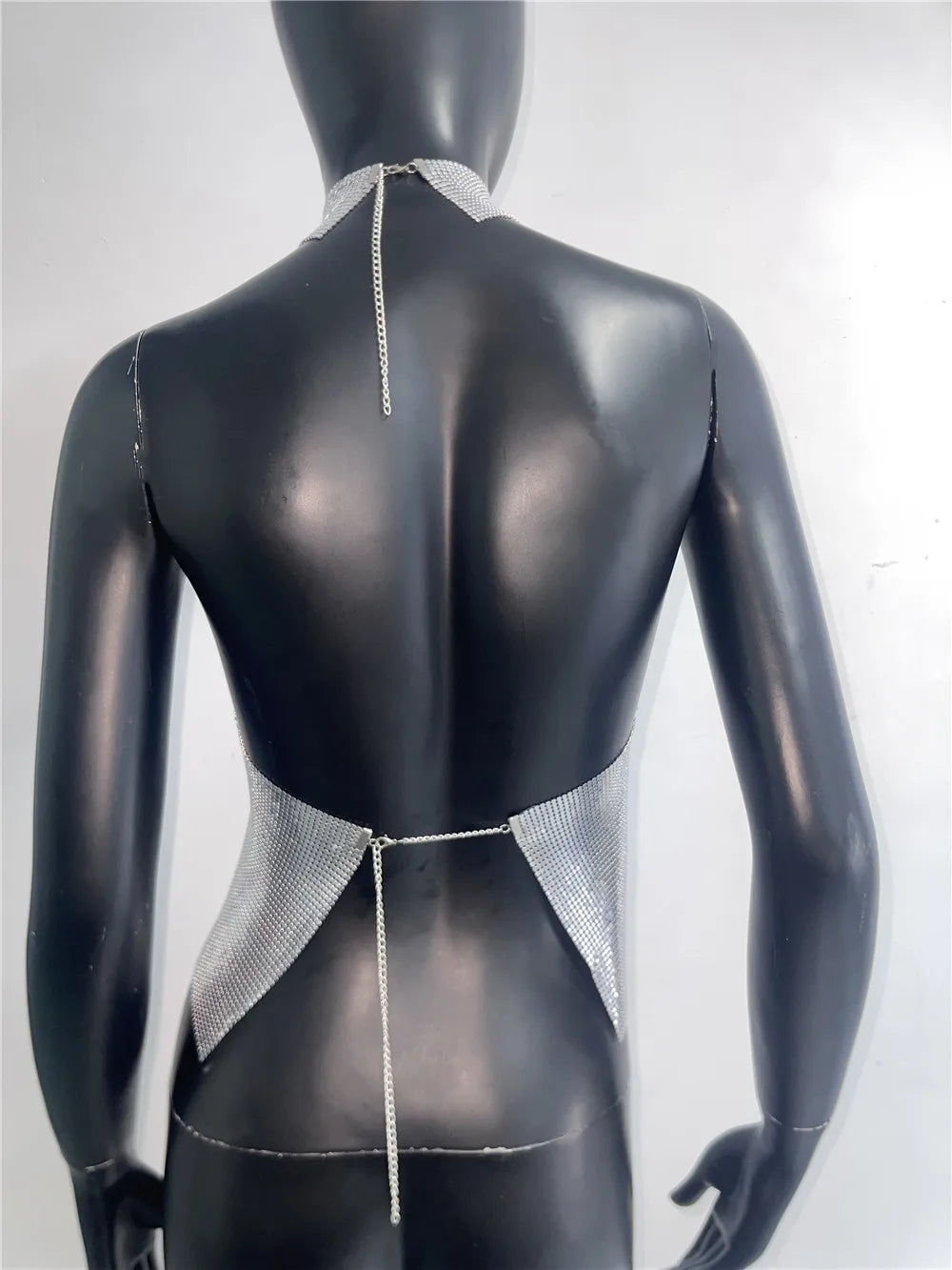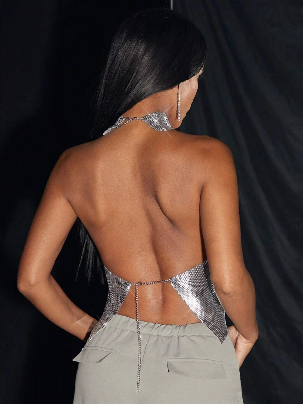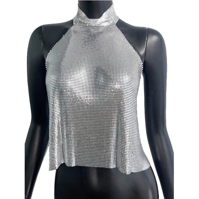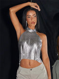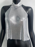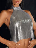 Débardeur sexy à paillettes métalliques pour femme, col haut, dos nu, épaules dénudées, style concert, soirée, Y2K