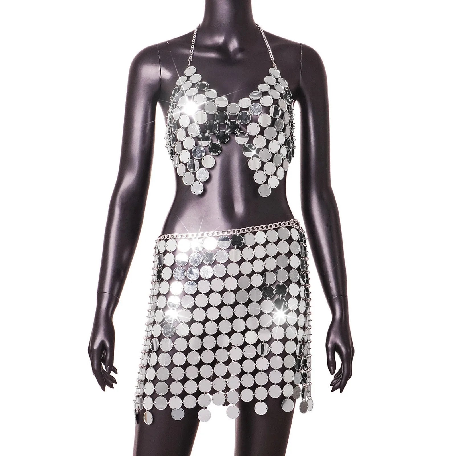 Shine bright at any event with this women’s sequin chain metal top, perfect for carnival, parties, or the nightclub scene. Designed with a metallic finish and eye-catching reflective sequins, this backless top features stylish hollow details and an adjustable chain for a custom fit. The unique combination of metal and sequins creates a bold, futuristic look that’s guaranteed to turn heads. Pair it with high-waisted bottoms or skirts for a striking outfit that exudes confidence and festival-ready glam.