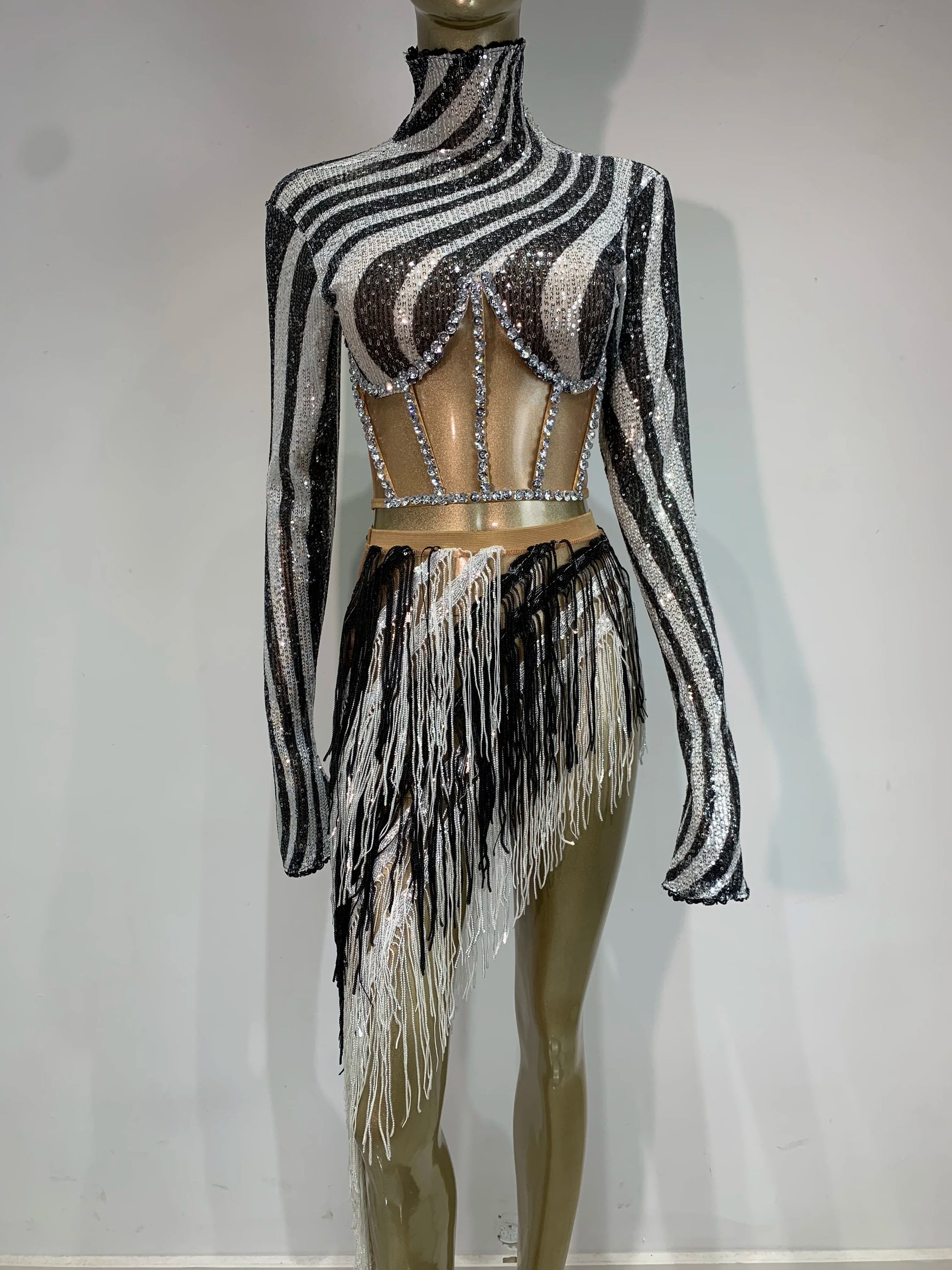 Women Sexy Sparkly Rhinestone Tassel Party Two Piece Set Women Birthday Nightclub Prom Crystal Fringe Leotard Dance Stage Outfit