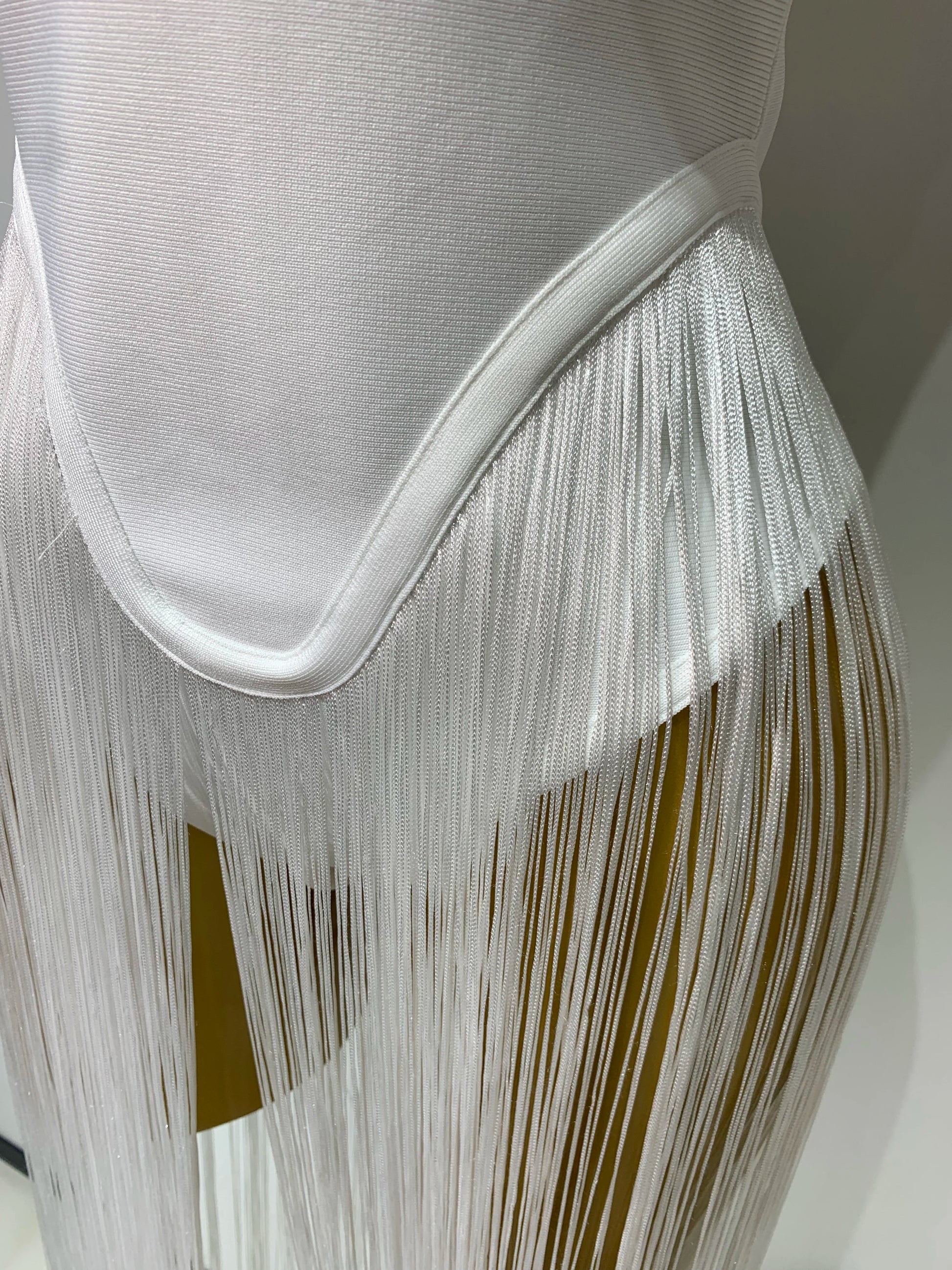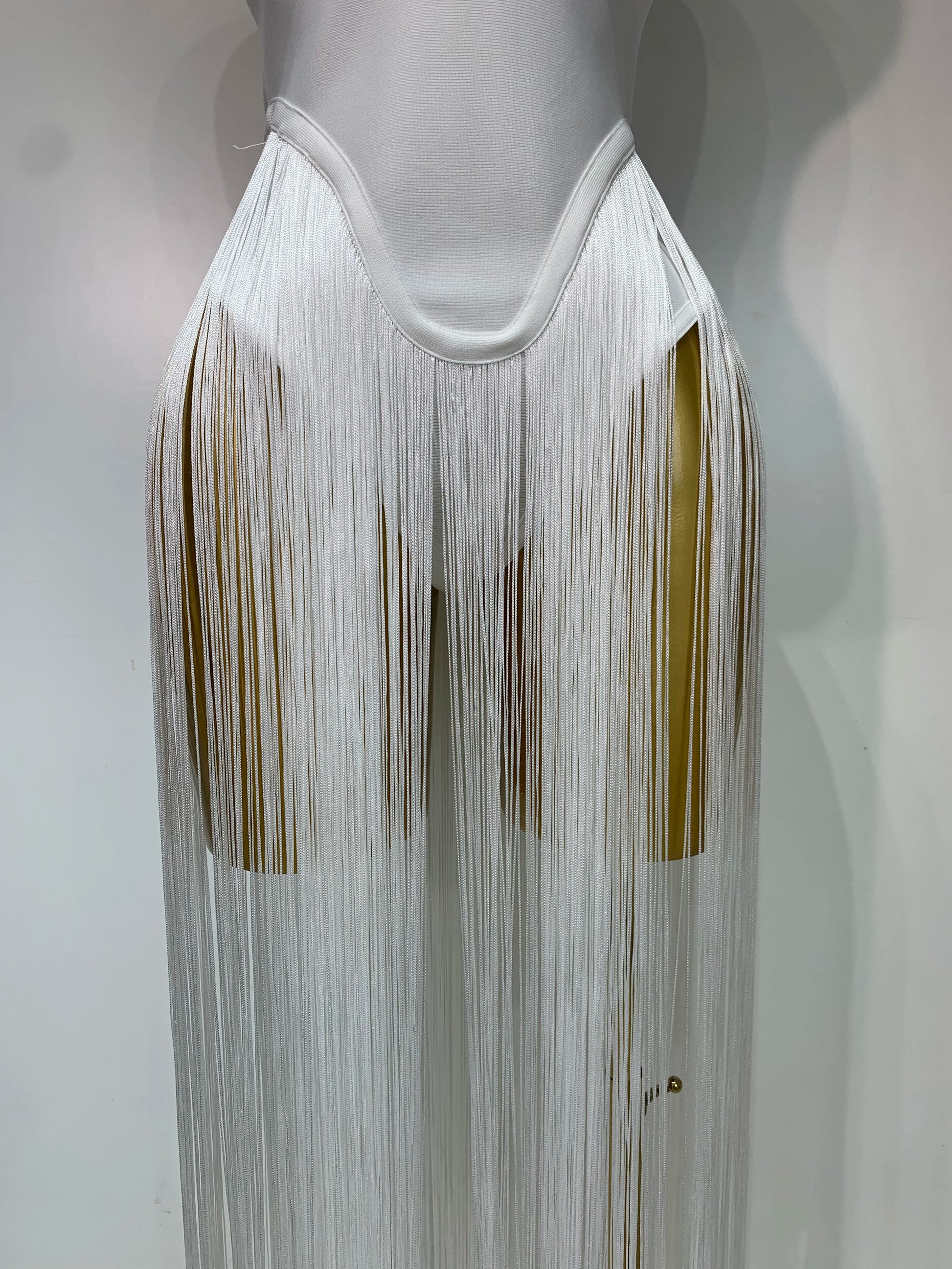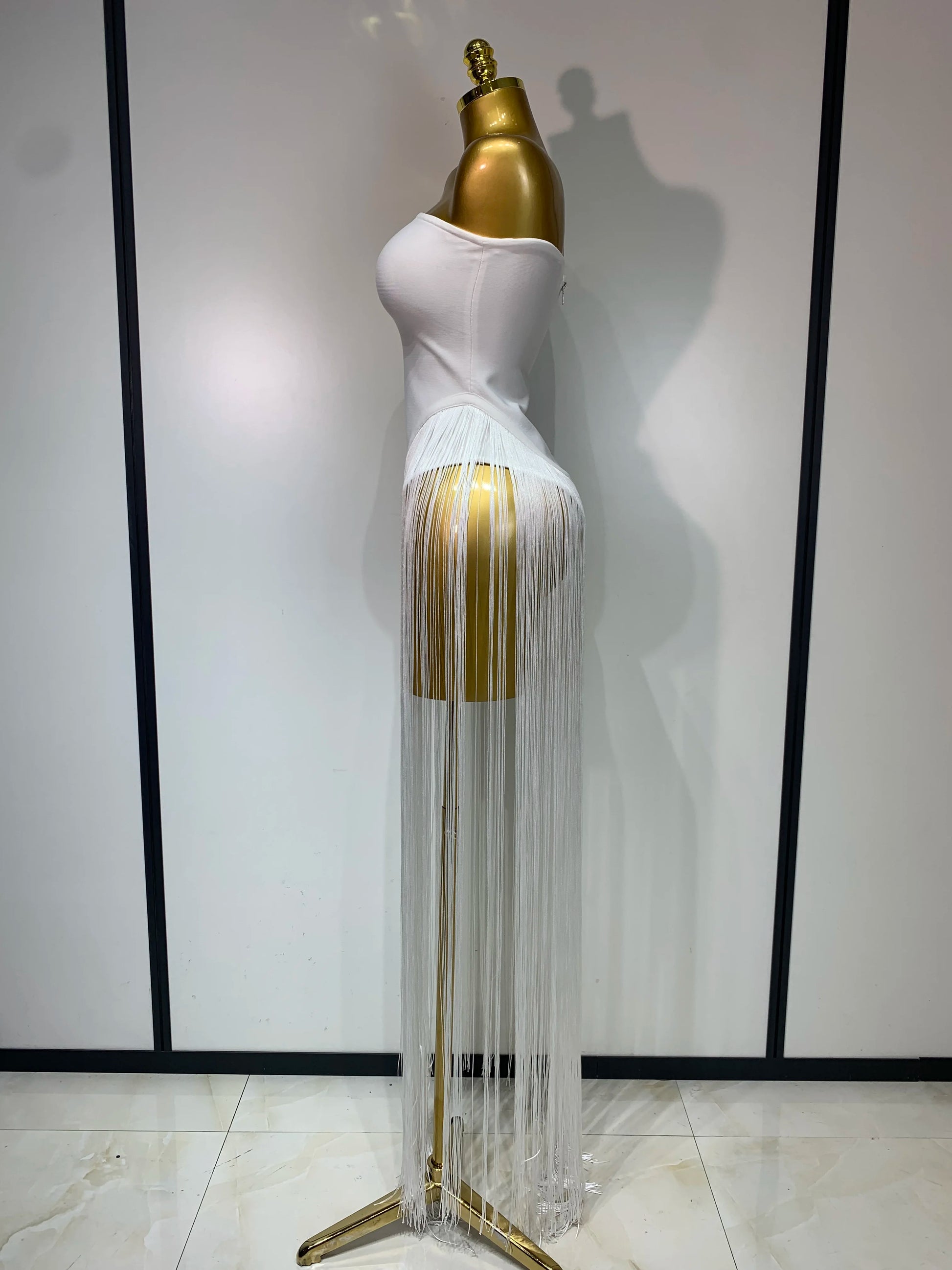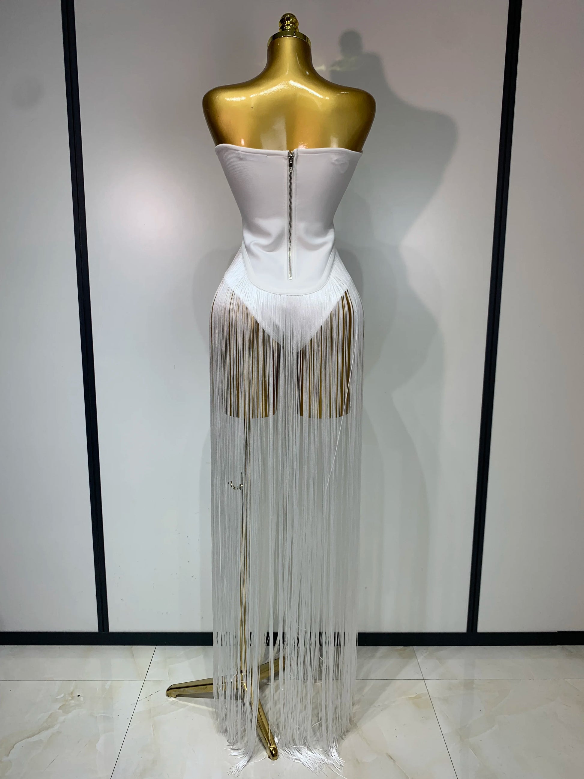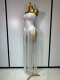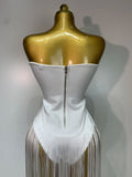 Make a grand entrance in this elegant white strapless bandage bodysuit, adorned with dramatic long tassels for added flair. Crafted to accentuate your silhouette, this luxury piece is perfect for evening parties, birthdays, and nightclub events. Designed with performers and singers in mind, it offers both style and confidence for any stage appearance or special occasion.