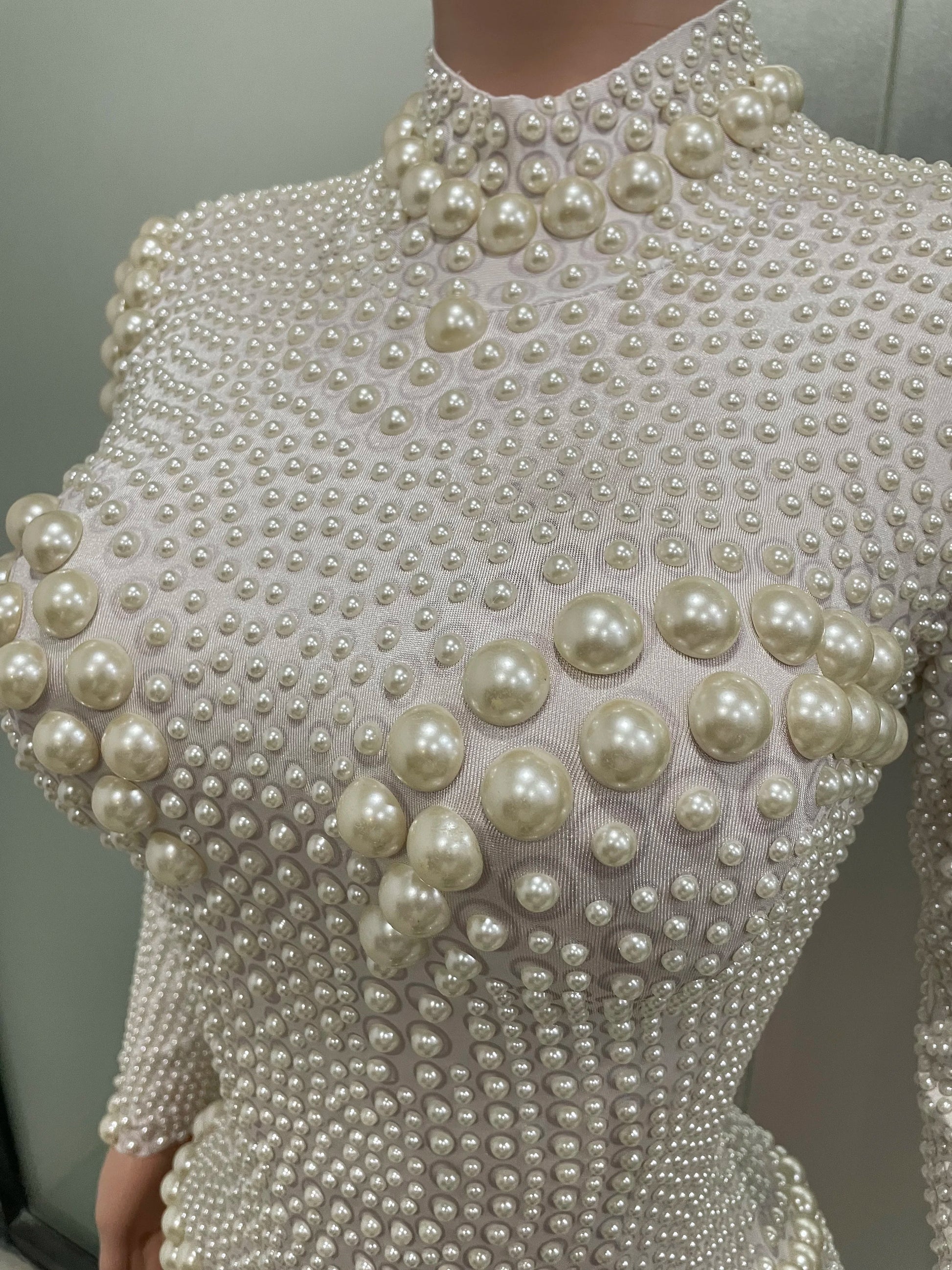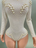 Robe de soirée sexy à manches longues pour femme, tenue de soirée moulante et élastique, avec perles blanches, idéale pour DJ et chanteuse