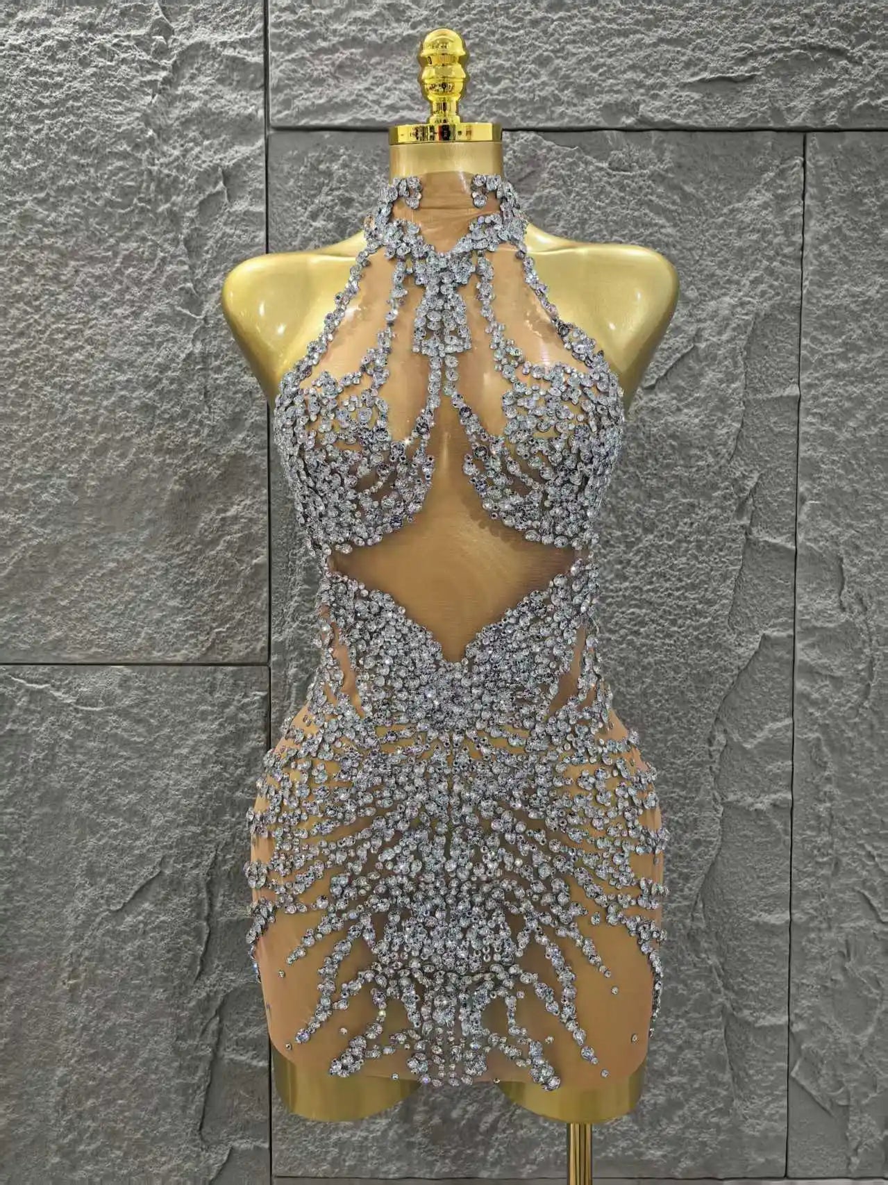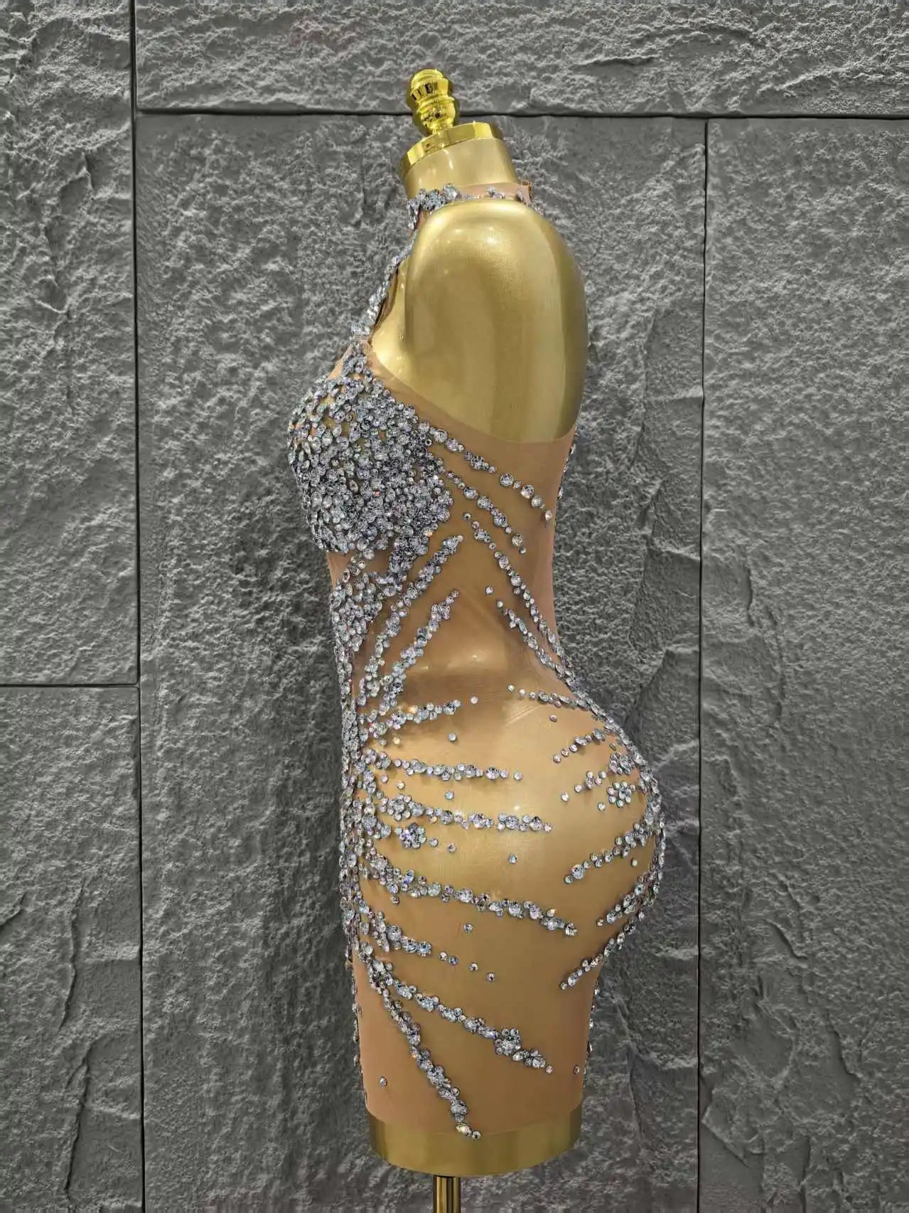 Step into the spotlight with this dazzling women’s sleeveless mini dress. Featuring a sexy off-the-shoulder design, this bodycon dress is adorned with shimmering crystals for eye-catching brilliance. The sheer mesh fabric creates a sultry, see-through effect that’s perfect for celebrating special nights at nightclubs, parties, or on stage. Make a bold and unforgettable impression with this glamorous party wear.