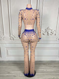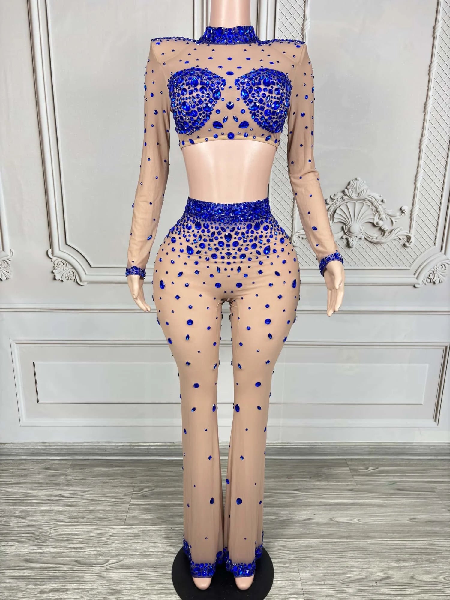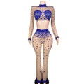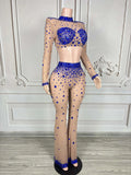 Women Sparkly Blue Rhinestone Mesh Two Pieces Pants Set Evening Celebrate Birthday Party Nightclub Photoshoot Costume
