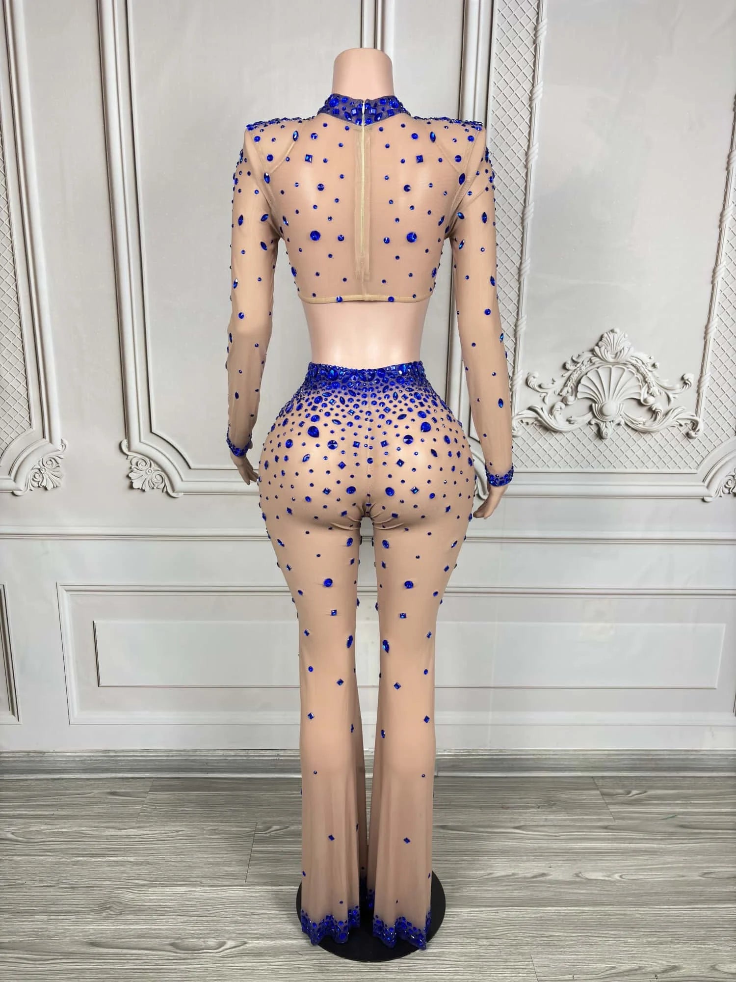 Elevate your night-out wardrobe with this dazzling Sparkly Blue Rhinestone Mesh Two-Pieces Pants Set, designed to command attention whether you’re celebrating a birthday, hitting the nightclub, or posing for a high-glam photoshoot. This coordinated ensemble blends sheer, shimmering mesh with precise rhinestone embellishments to create a look that’s bold, feminine, and endlessly photogenic