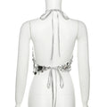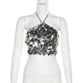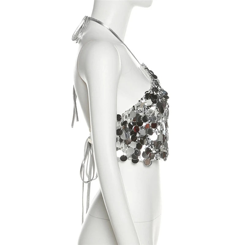 Women Summer Sexy Halter Tie Backless Camisole Glitter Silver Sequins Sleeveless Crop Top Bandeau Vest Clubwear