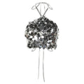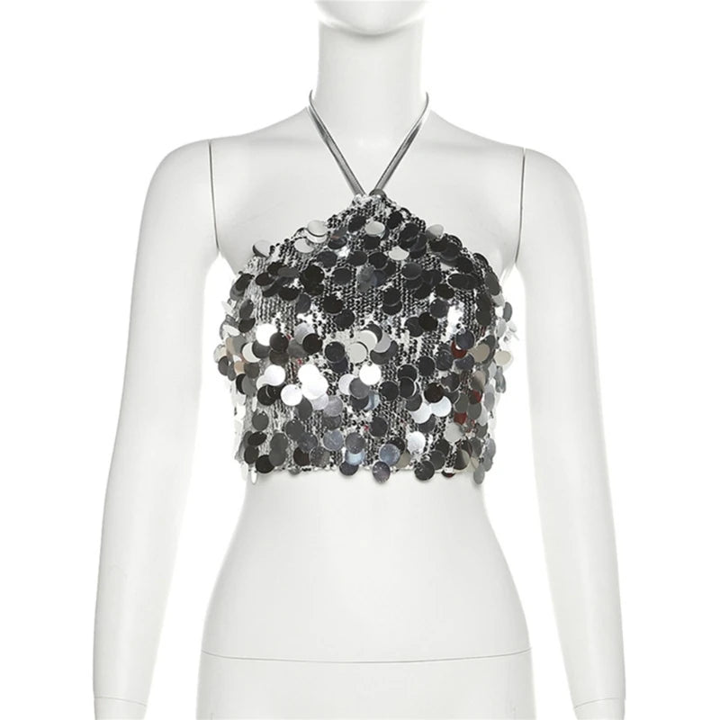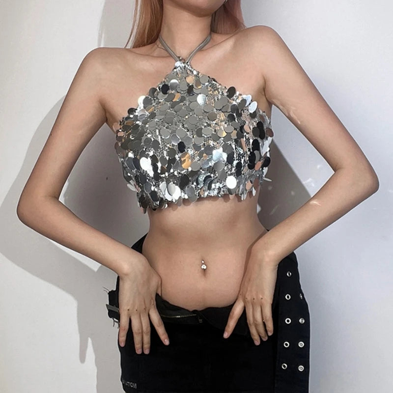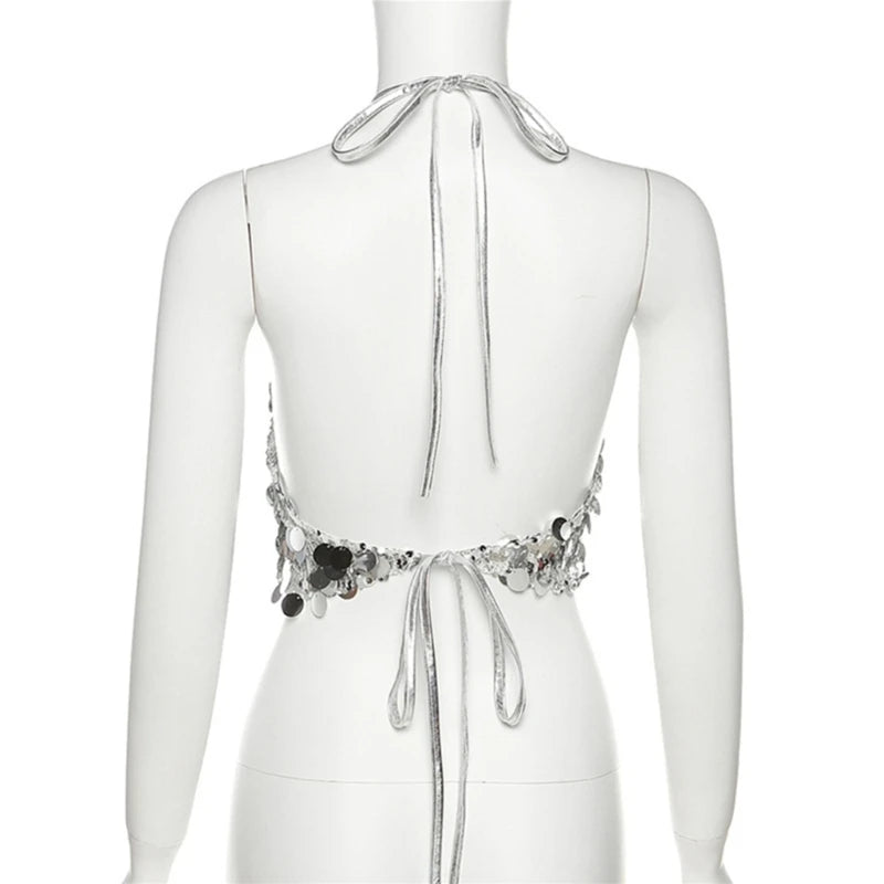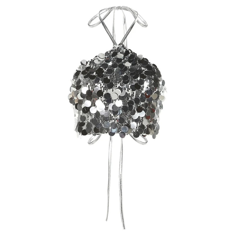 Shine bright this summer with this sexy halter tie backless camisole for women. Covered in dazzling silver glitter sequins, this sleeveless crop top features a chic bandeau vest design that flatters your figure while keeping you cool. The adjustable halter tie and open back add a bold, flirty touch, making it the perfect choice for clubwear, parties, or any night you want to stand out and sparkle.