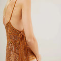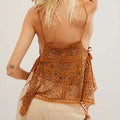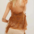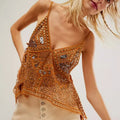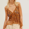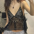 Turn up the retro glam with this Women’s Y2K Rivet Sequin Mesh Tank Top. Featuring a sparkling array of sequins and rivet details, this sheer halter cami crop top stands out with a deep V-neckline and beaded accents. The backless, sleeveless design gives it extra allure, while the mesh fabric adds a playful, flirty vibe. Perfect for parties, club nights, or festival looks, this glittery sparkly camisole shines bright for anyone craving bold Y2K-inspired style.