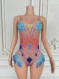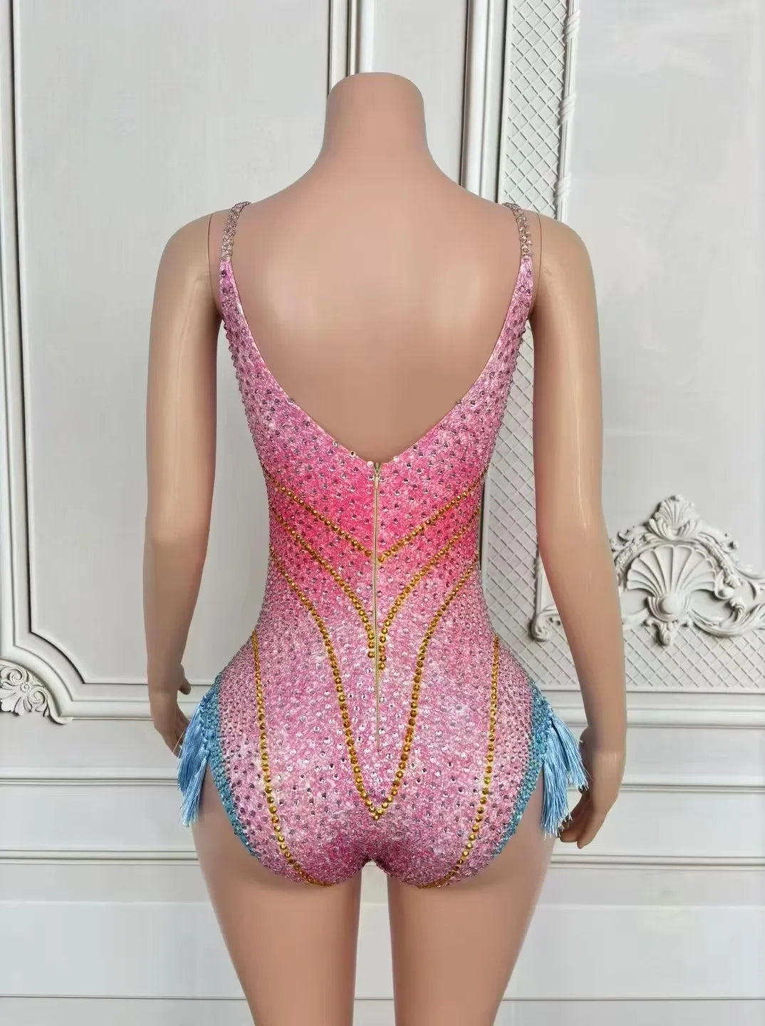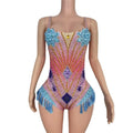 Womens Sexy Shiny Pink Rhinestones Fringe Bodysuit Party Performance Dance Costume Nightclub Singer Bar Dancer Stage Outfit
