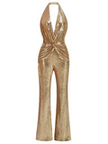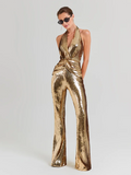 Combinaison sans manches à paillettes dorées pour femme, sexy, col en V, paillettes scintillantes, taille haute, pantalon large, soirée, célébrité