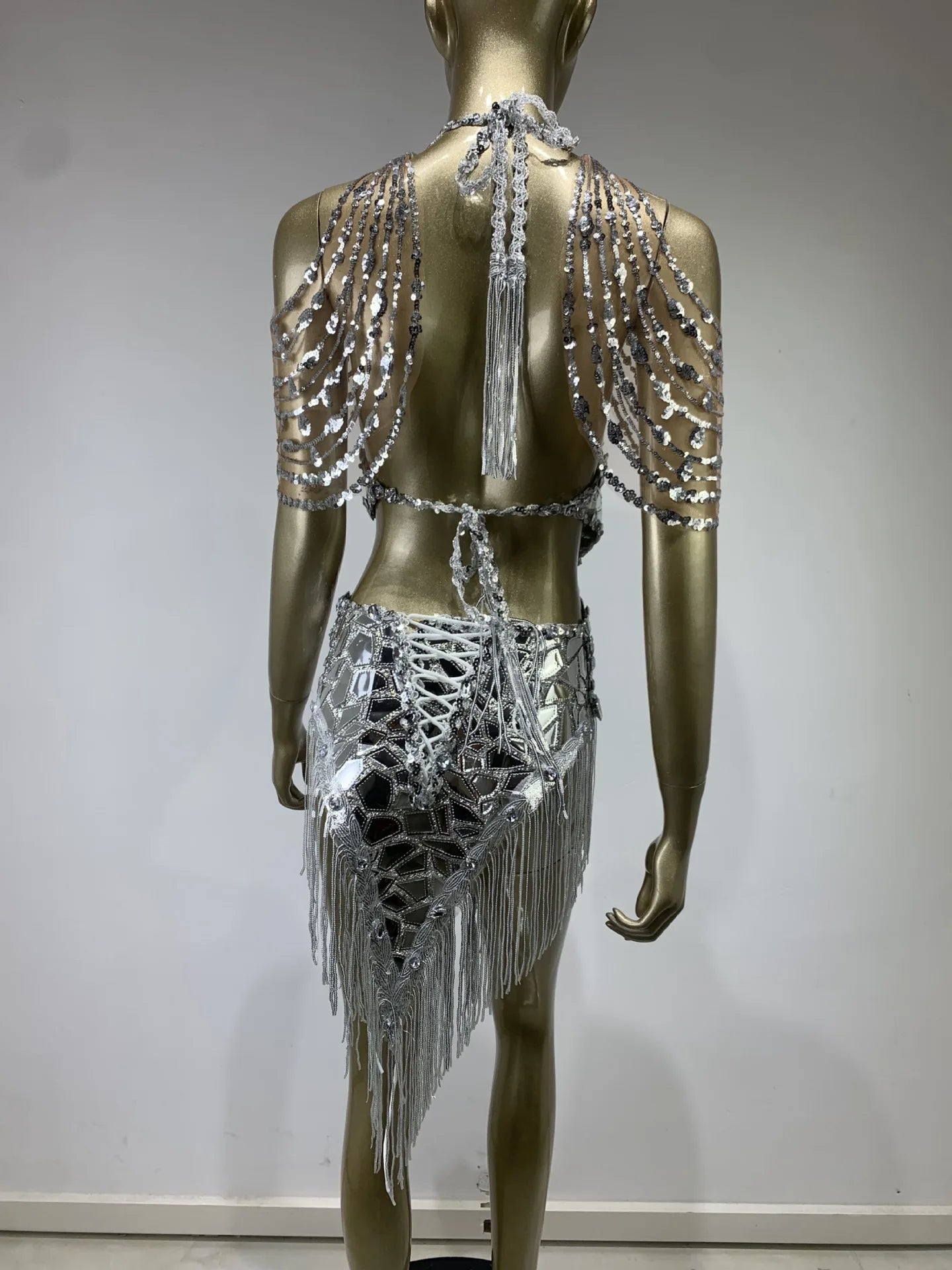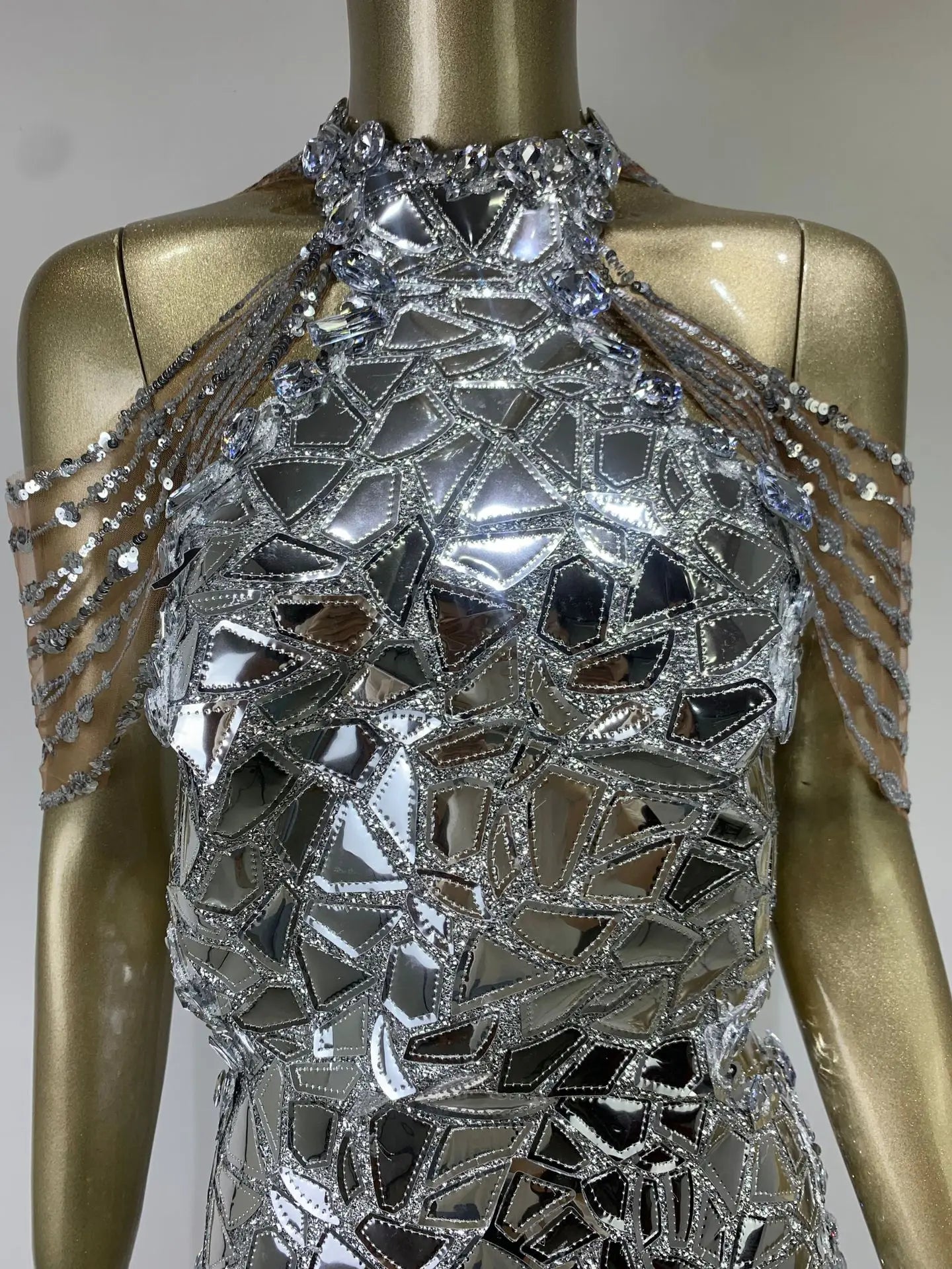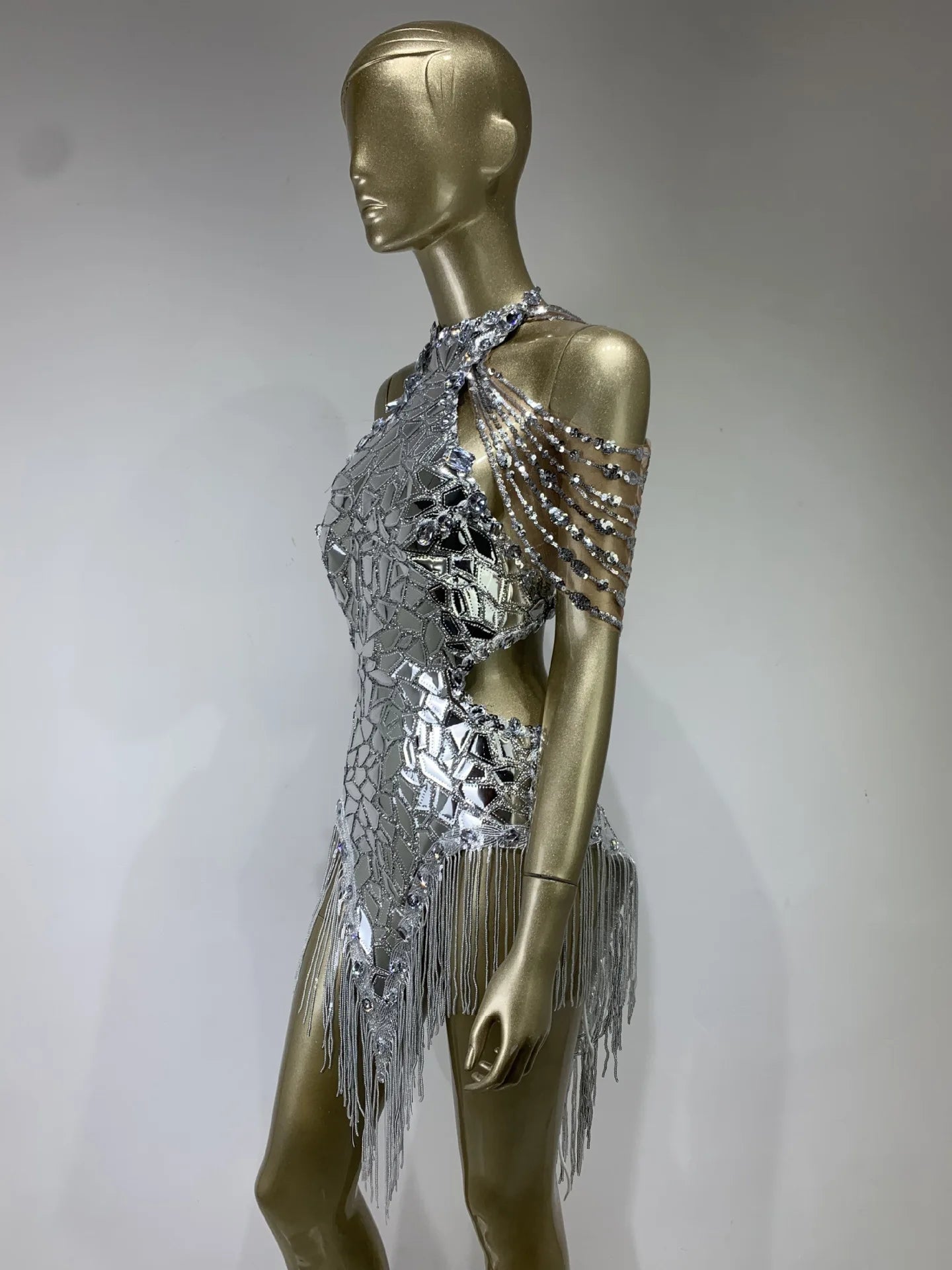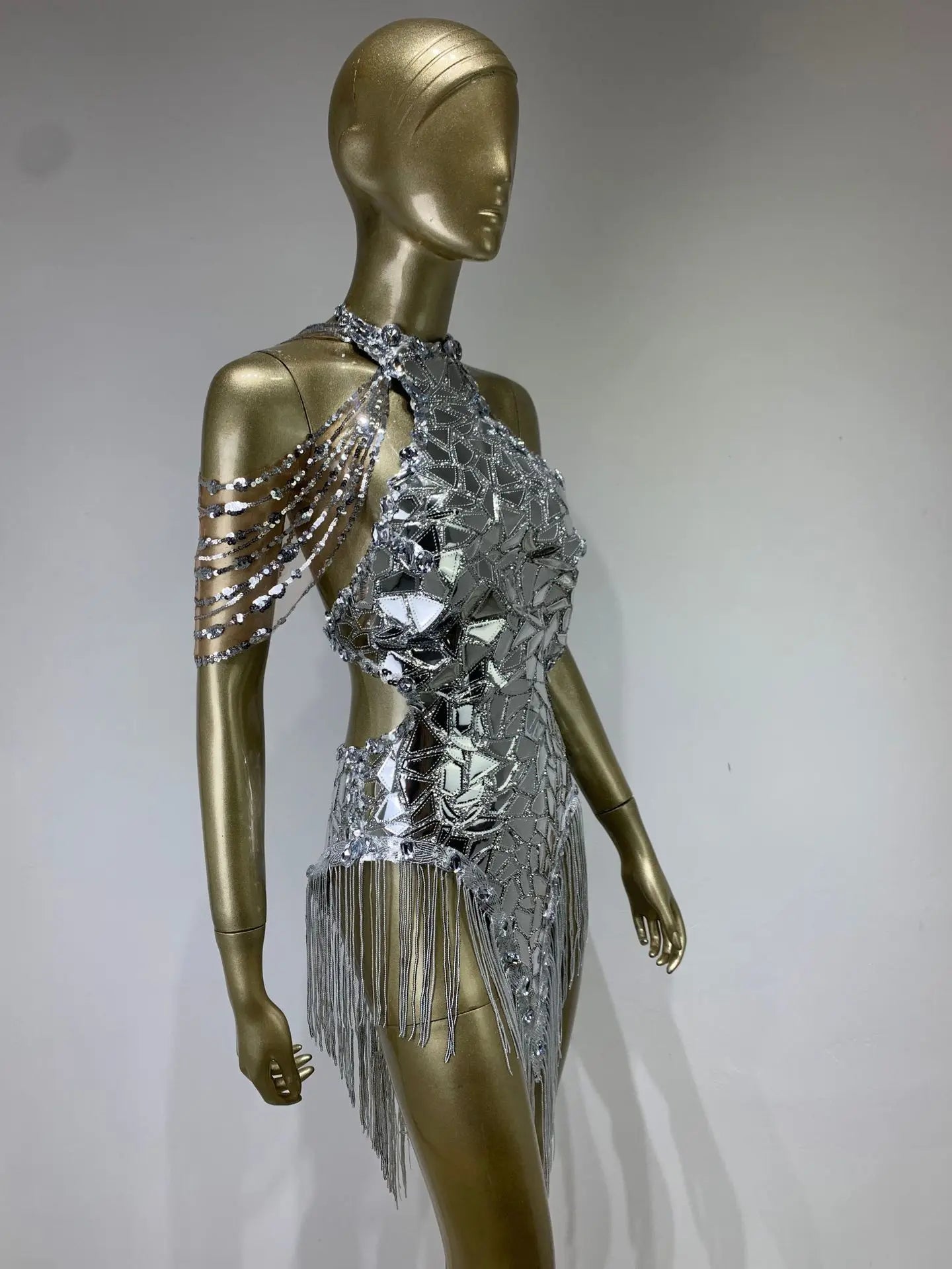 Soyez sous le feu des projecteurs avec cette robe de soirée pour femme d'inspiration années 2000. Avec sa teinte argentée éclatante, son décolleté dos nu et son dos nu, cette mini-robe scintille de paillettes scintillantes et de pompons fantaisie. Sa coupe moulante flatte votre silhouette, tandis que ses détails d'inspiration mécanique ajoutent une touche futuriste unique. Idéale pour les soirées, les soirées à thème ou pour une déclaration audacieuse, cette pièce accrocheuse allie nostalgie et style avant-gardiste pour un look inoubliable.