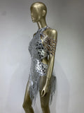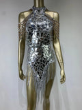 Robe de soirée moulante argentée style Y2K pour femme, col licou, épaules dénudées, dos nu, paillettes, pompons, mini-robe mécanique