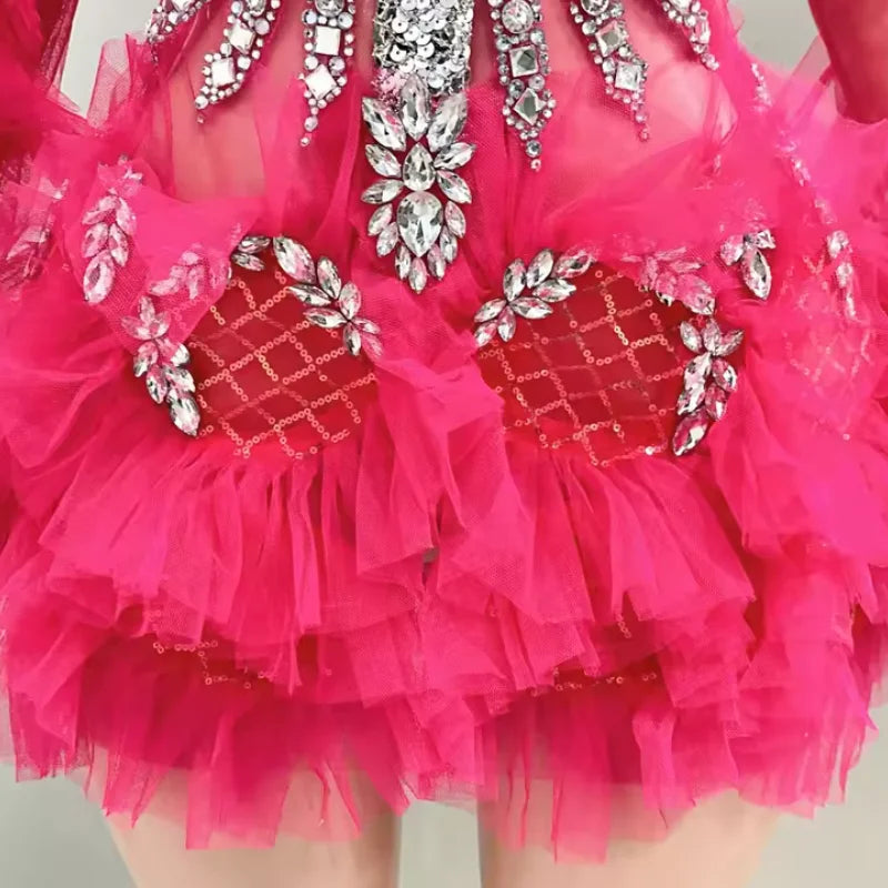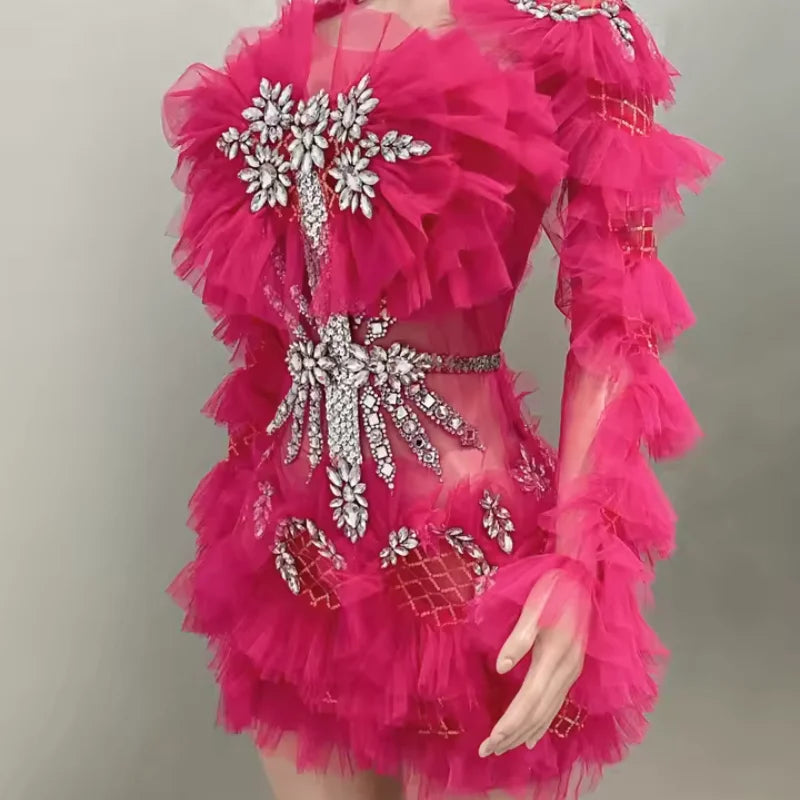 Shiny Peach Red Sexy Layer Pleated Mesh Dress Evening Dress Performance Clothing Singer Stage Clothing