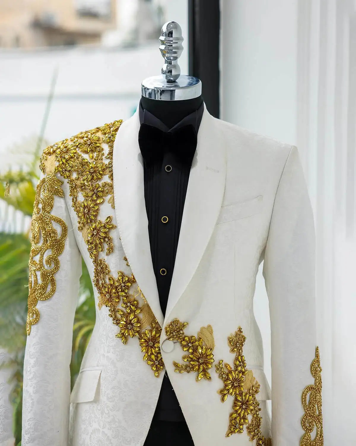 Luxurious Custom Made Wedding Tuxedo for Men with Gold Crystal Appliqués and Elegant Shawl Lapel – Perfect Suit for Groom and Special Occasions