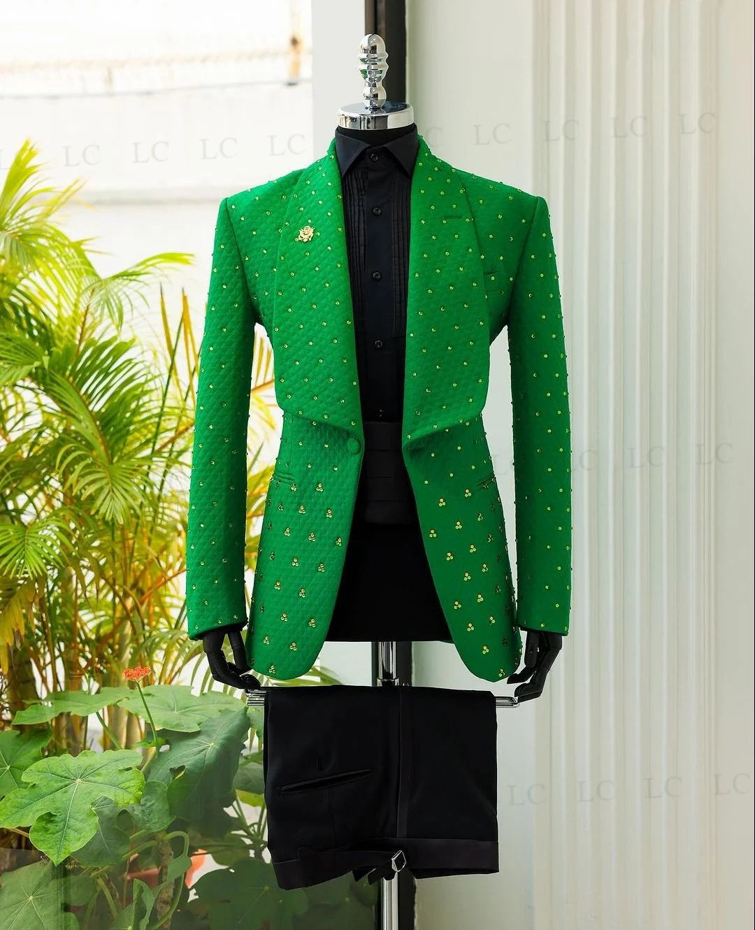 Dazzling Green Beaded Tuxedo Suit Set for Men - Stylish Wide Lapel Formal Wear for Weddings, Proms, and Special Events, Available in Plus Sizes