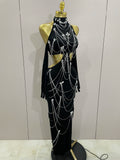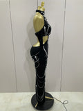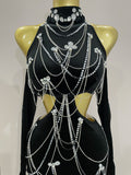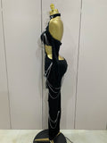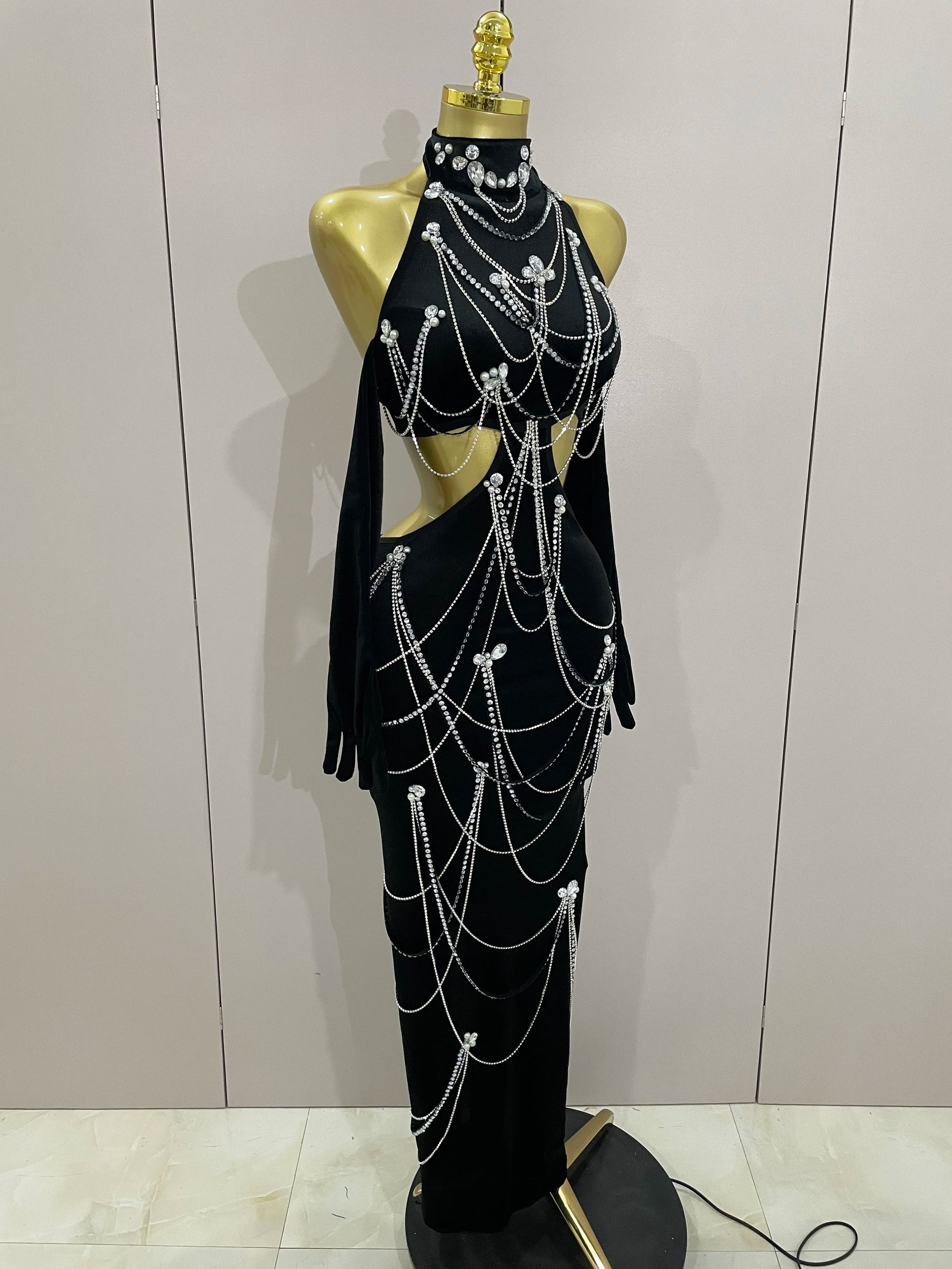 Make every entrance unforgettable with this Women’s Sparkly Diamonds Tassels Chain Black Halter Dress, a seductive and glamorous choice for evening events, birthday celebrations, and stage performances. Crafted to combine high drama with elegant sophistication, the dress features a figure-skimming silhouette that flatters curves while allowing freedom of movement for dancing and performing.