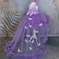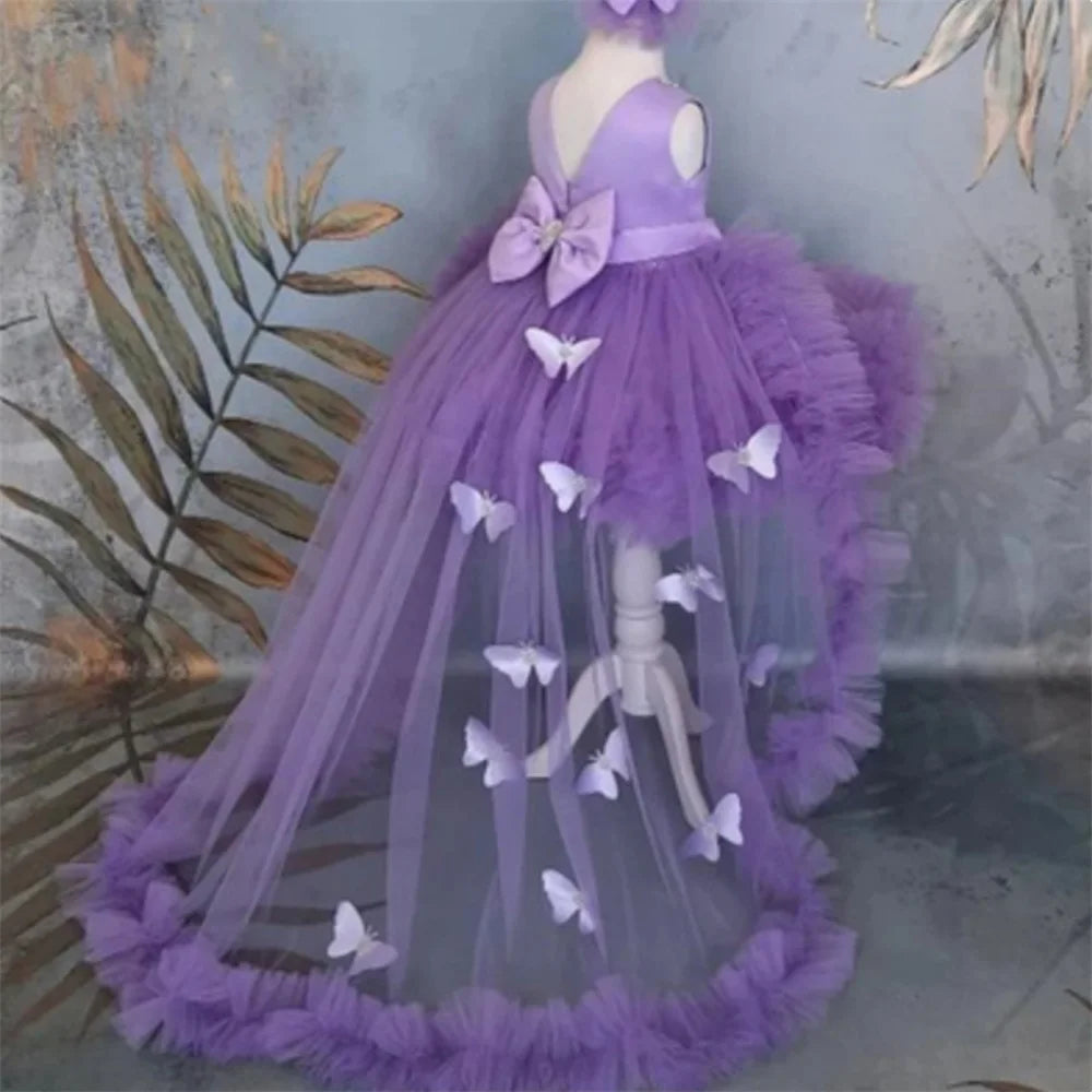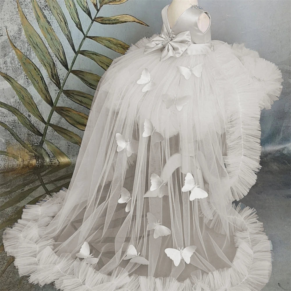Pink Butterfly Tulle Princess Dress for Girls with Long Train and Bow
