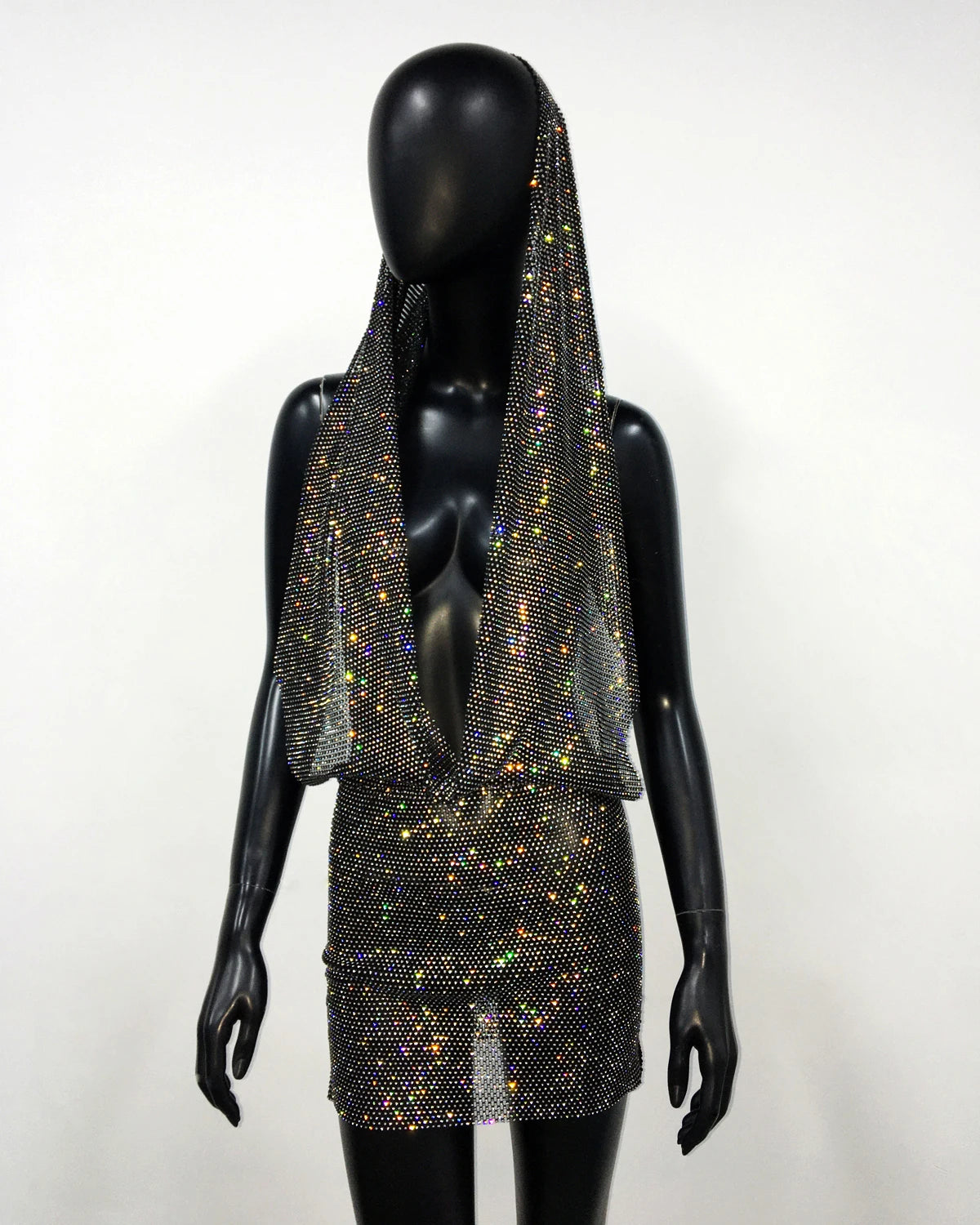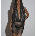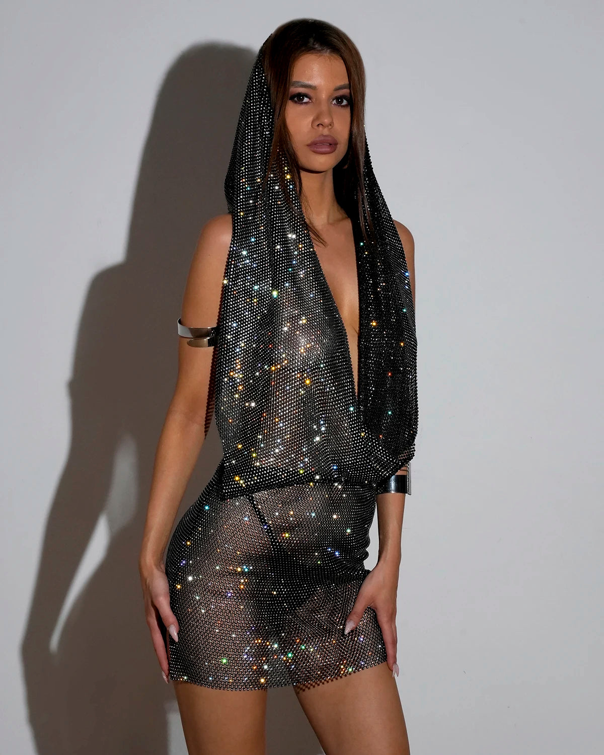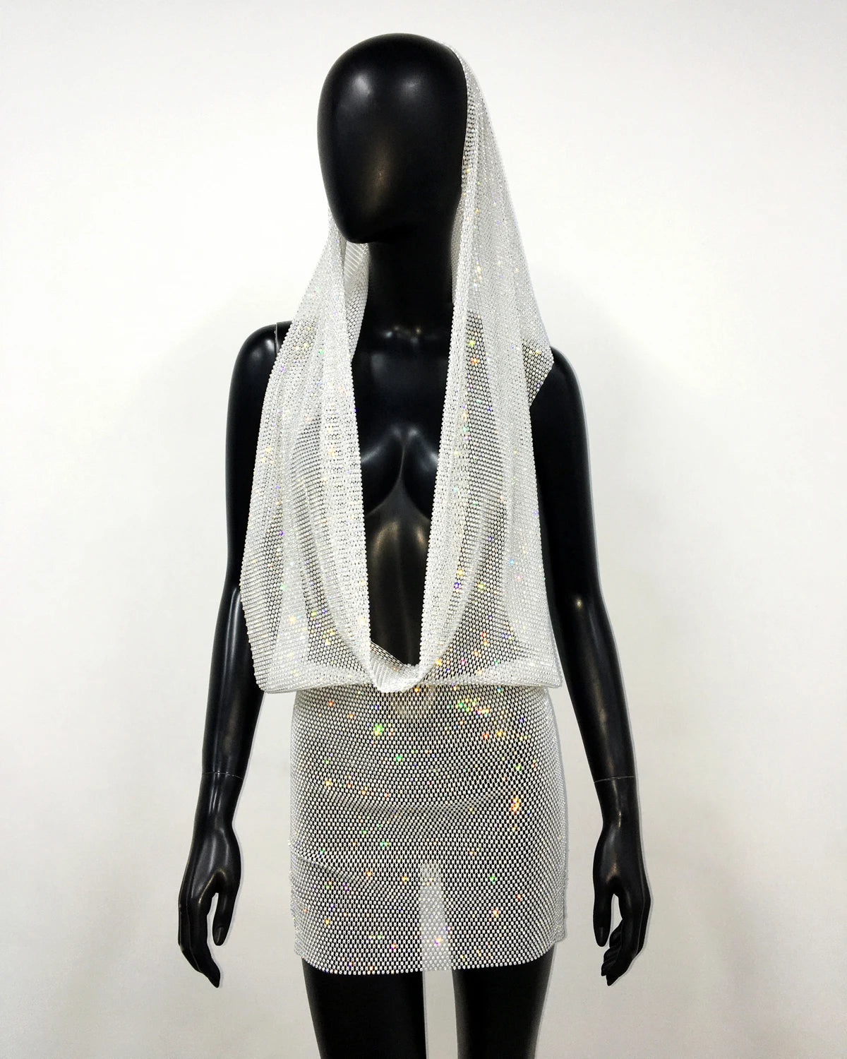 Step into bold Y2K style with this glitter fishnet skirt suit for women. This stunning 2-piece set includes a low-cut mesh crop top and a matching elastic waist wrap hip skirt, both adorned with sparkling details. Paired with a coordinating mesh turban, this trendy outfit is perfect for parties, festivals, or summer beachwear, giving you a confident and eye-catching look.