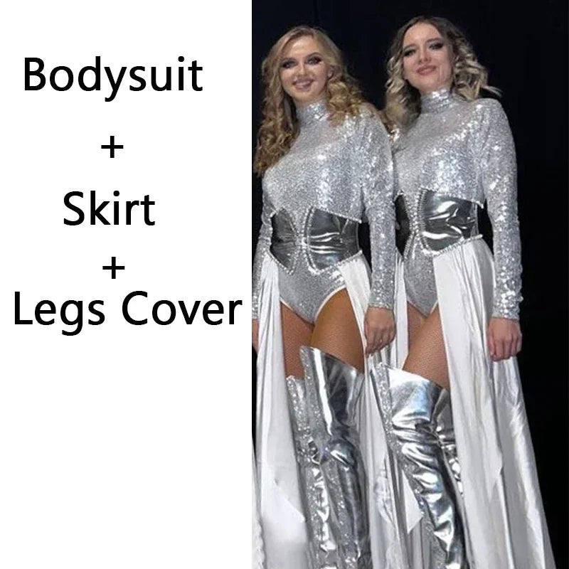 Bar Nightclub Dj Ds Performance Rave Outfits Women Sexy Gogo Dance Costumes Silver Sequins Bodysuit Laser Legs Cover
