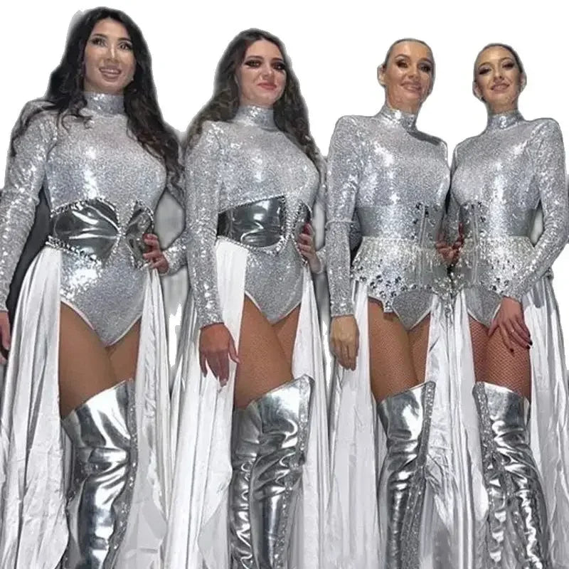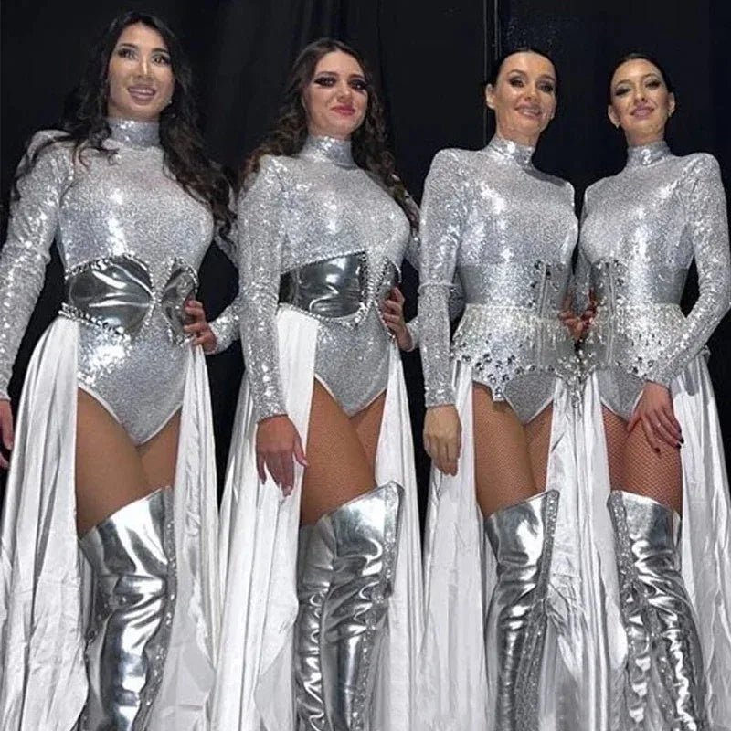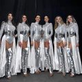 Turn up the energy and light up the night with this electrifying Bar & Nightclub performance outfit designed for DJs, dancers, ravers, and gogo artists who want maximum impact. Combining high-shine silver sequins, body-sculpting construction, and futuristic laser-leg coverage, this costume is built to catch club lights, strobes, and camera flashes while keeping you comfortable and performance-ready.