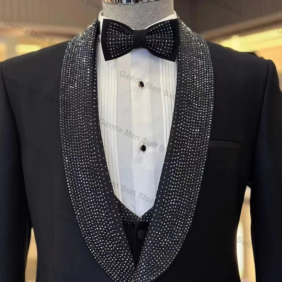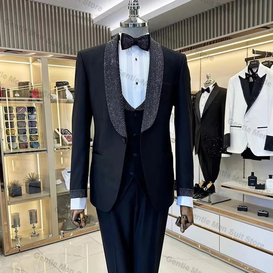 Black Crystals Men Suits Set 3 Piece Blazer+Vest+Pant Spring Prom Groom Wedding Tuxedo Coat Tailored Made Formal Office Jacket