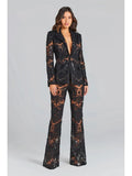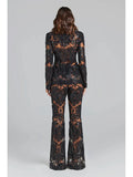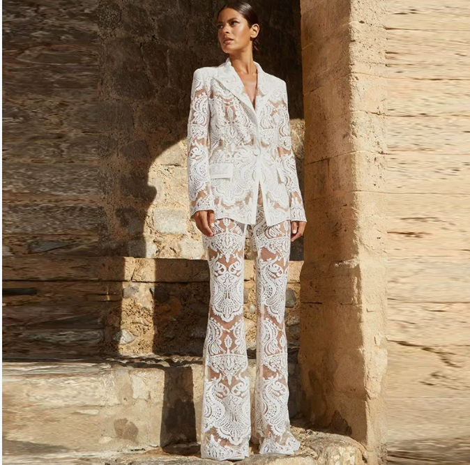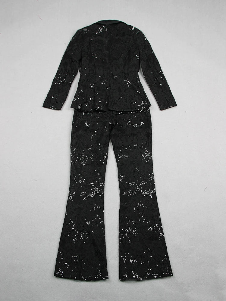 Elevate your wardrobe with the Newest Runway Suit Set, featuring a chic single-button guipure lace blazer paired with elegant flare pants. Tailored for a flattering silhouette, the blazer showcases intricate lace detailing and a refined notch lapel, while the high-waisted flare trousers elongate the legs for a sophisticated finish. Perfect for parties, events, or elevated office looks, this set blends feminine texture with modern tailoring for a standout ensemble. Style with heels and minimal jewelry for an effortlessly polished appearance.