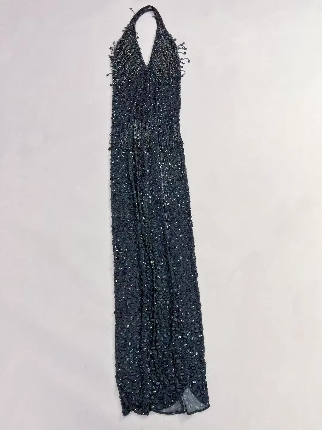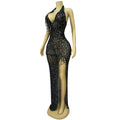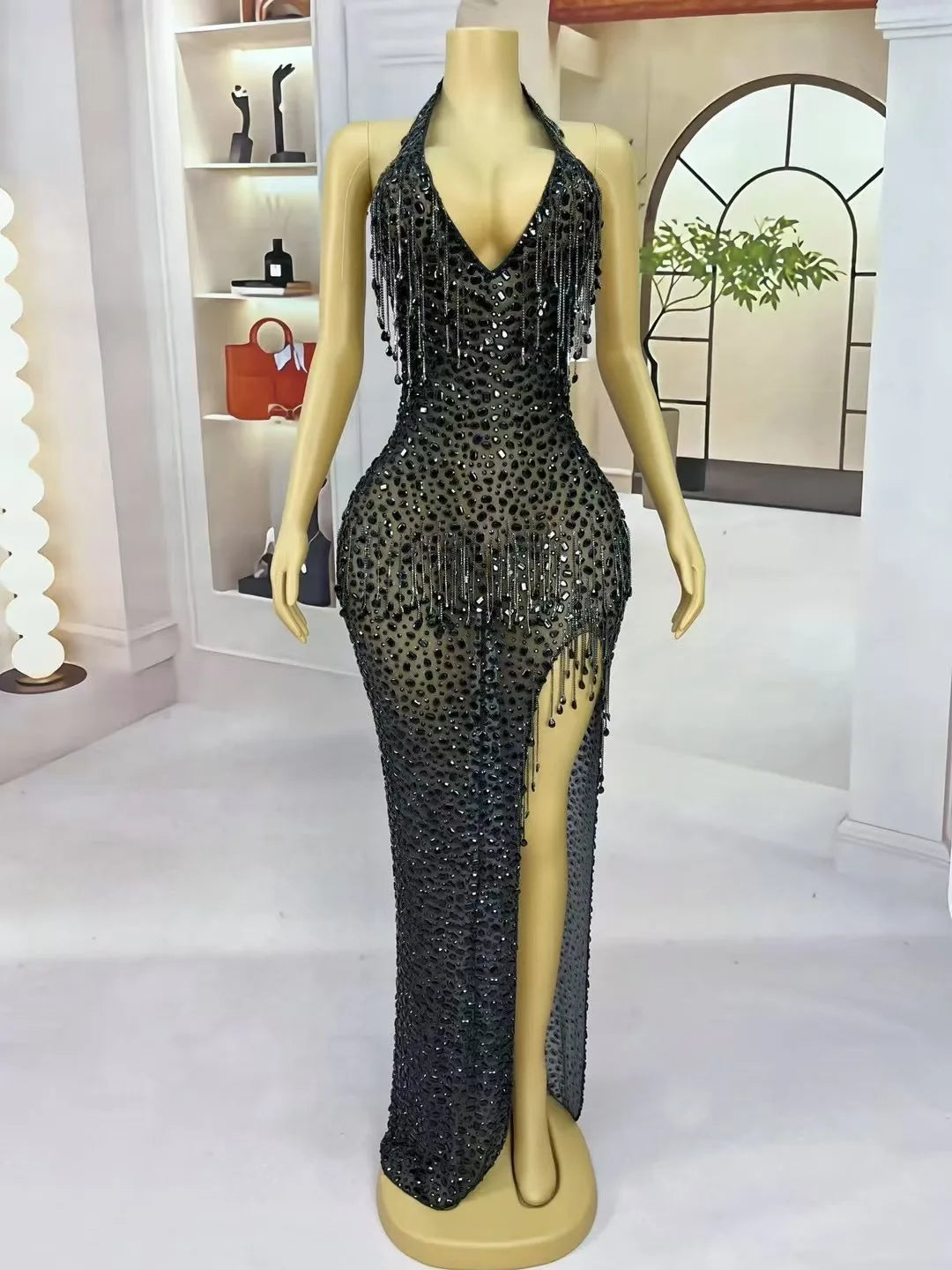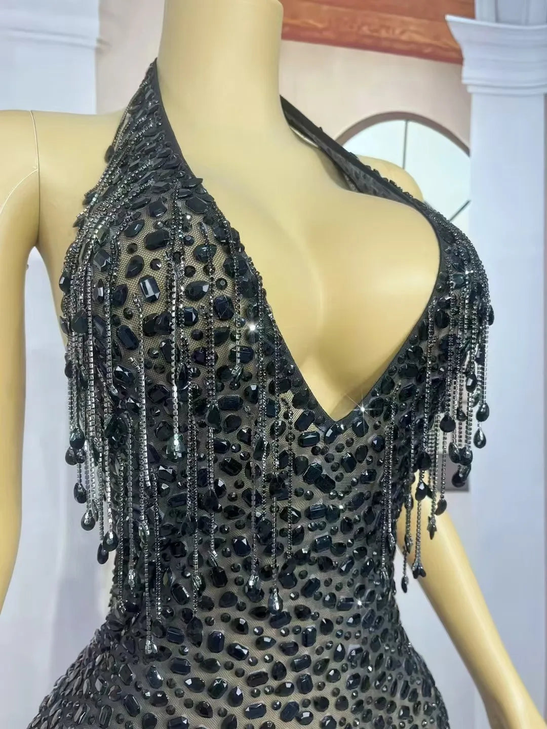 Draped in decadence and designed to command attention, this Black Rhinestones Crystals Chain Heavy Luxury Gown is the ultimate statement piece for red carpet events, runway shows, and high-profile photoshoots. Tailored to sculpt and flatter, the dress features a daring V-neckline that draws the eye to a graceful décolletage and a dramatically low, backless silhouette that reveals just enough skin to be sensual while maintaining an air of sophisticated glamour. The body-hugging cut is engineered to celebrate the female form, creating an elongated, statuesque profile ideal for evening galas, celebrity appearances, and luxe parties.