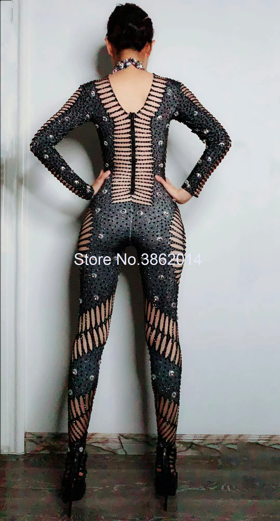 Bling Crystals Rhinestones Spandex Stretch Jumpsuit Women Evening Party Outfit Nightclub Bar Singer Bodysuit Sexy Dance Costume