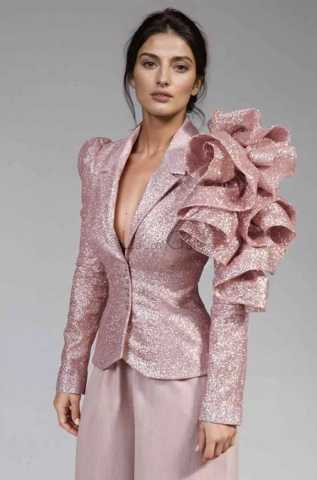 Make a bold entrance in this bling pink blazer dress, featuring sparkling accents and dramatic tiered ruffles. Designed with long sleeves and tailored for a powerful silhouette, this custom-made one-piece gown is perfect for parties, formal events, or making a stylish statement on the street. Effortlessly blending glamour with sophistication, it’s the ultimate choice for women who want to turn heads and stand out.