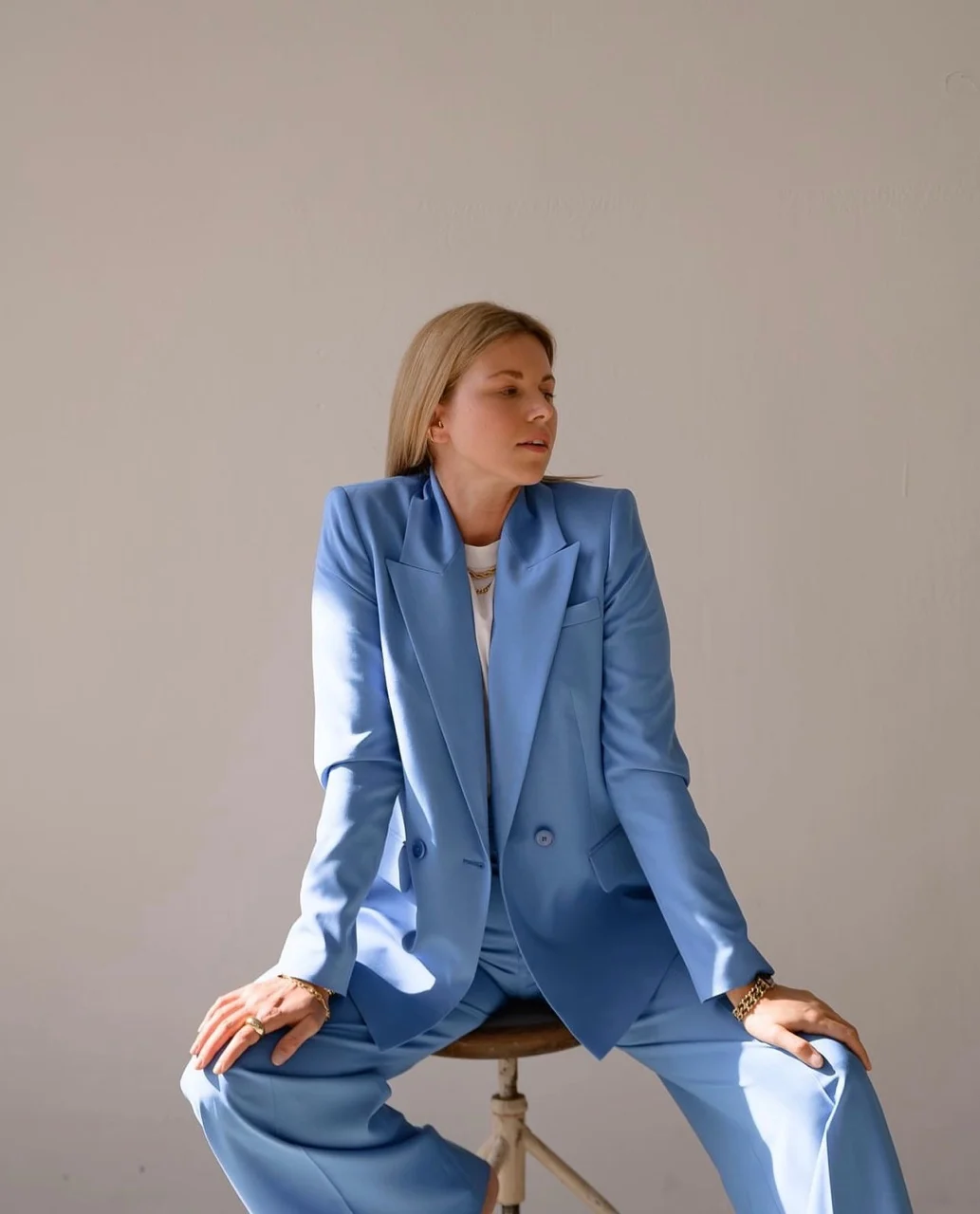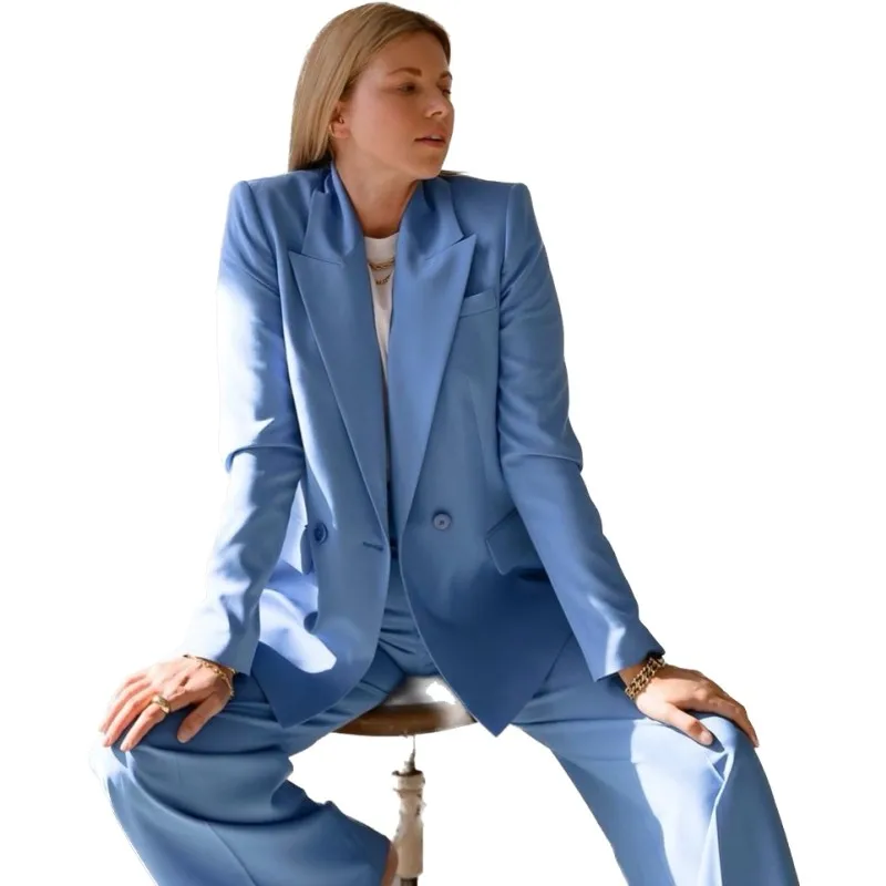 Blue Casual Women Suits 2 Piece Suits With Blazer Pant Plus Size Loose Wide Leg Pants Ladies Suit For Work