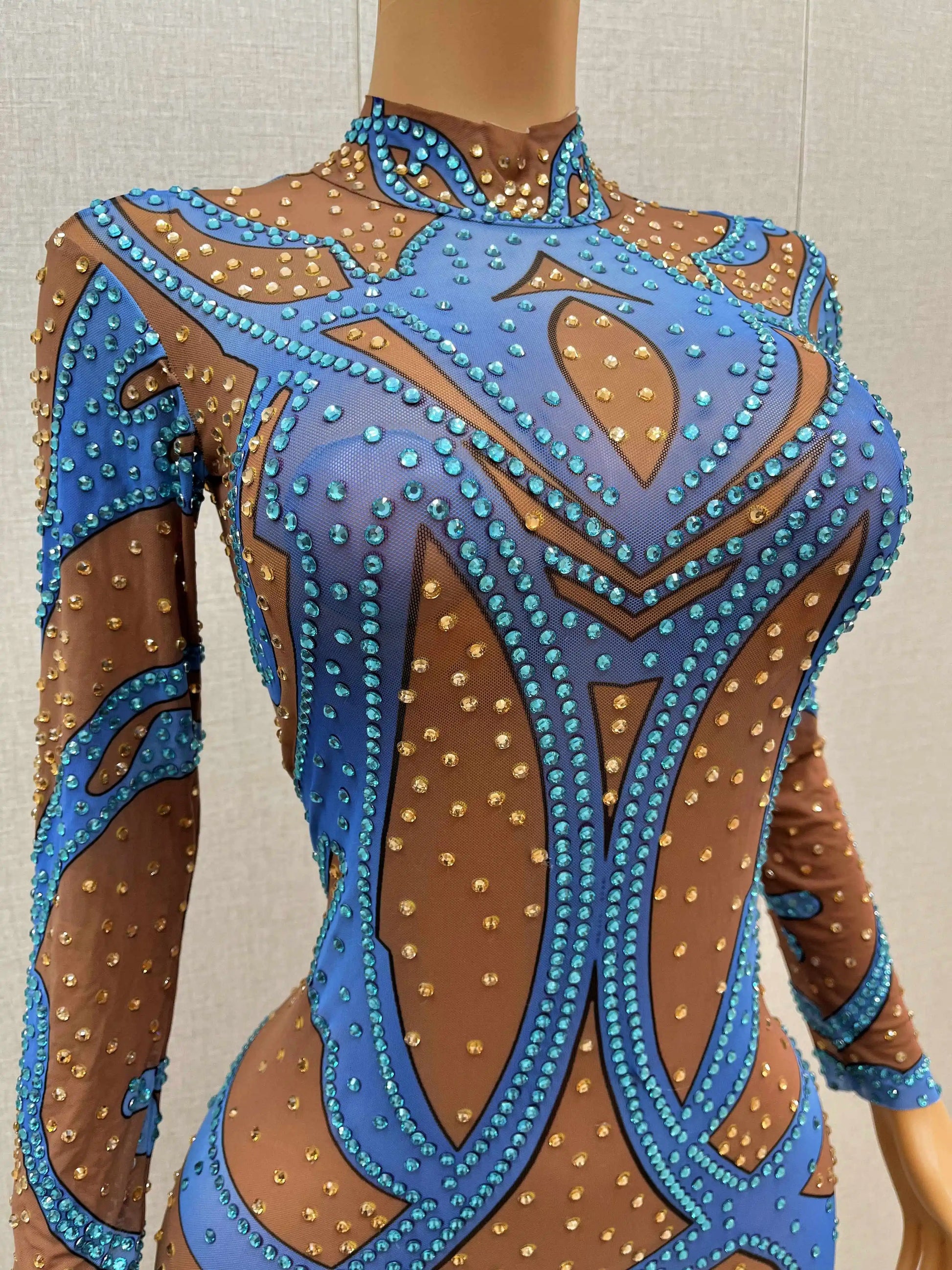 Make a show-stopping entrance in this Blue & Gold Rhinestone Stretch Jumpsuit. Featuring a unique, niche design with sparkling rhinestones and diamond accents, this sensual, sexy jumpsuit fits like a second skin and moves with you. The stretchy fabric ensures comfort and a flattering silhouette—perfect for dance performances, parties, or bold night-out statements. Embrace the spotlight with leggings-style legs and dazzling glamour.