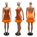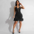 Bodycon Women Backless Lace Up Halter See Through Sequins Mesh Patchwork Sexy Party Dress Feather Hem Fashion Night Club Dress