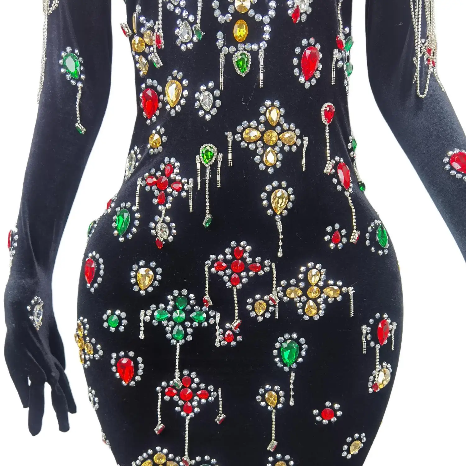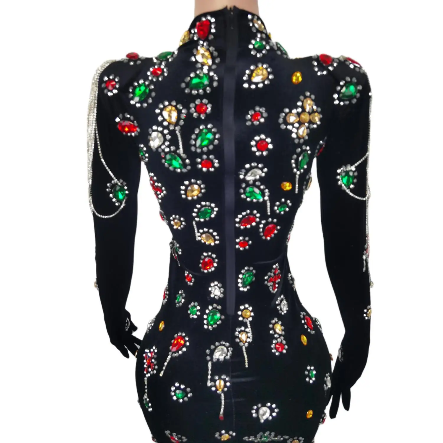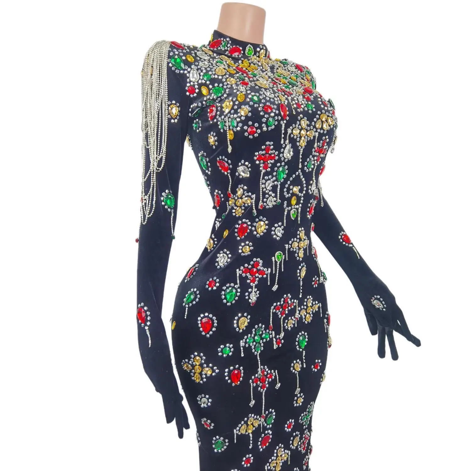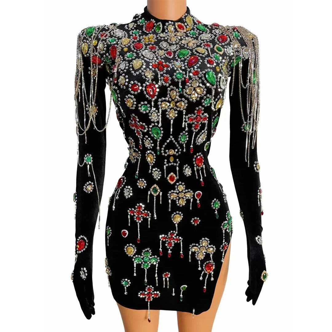 Brand Design Colorful Stones Black Velvet Dress Evening Sexy Crystals Chains Dance Costume Birthday Gloves Dress Caihongtang