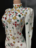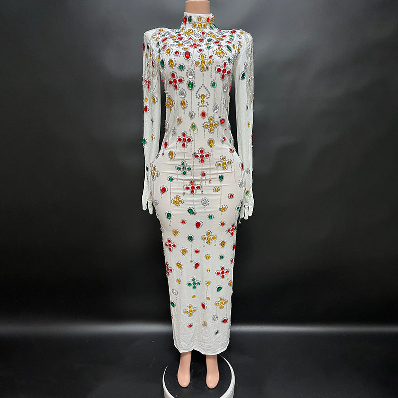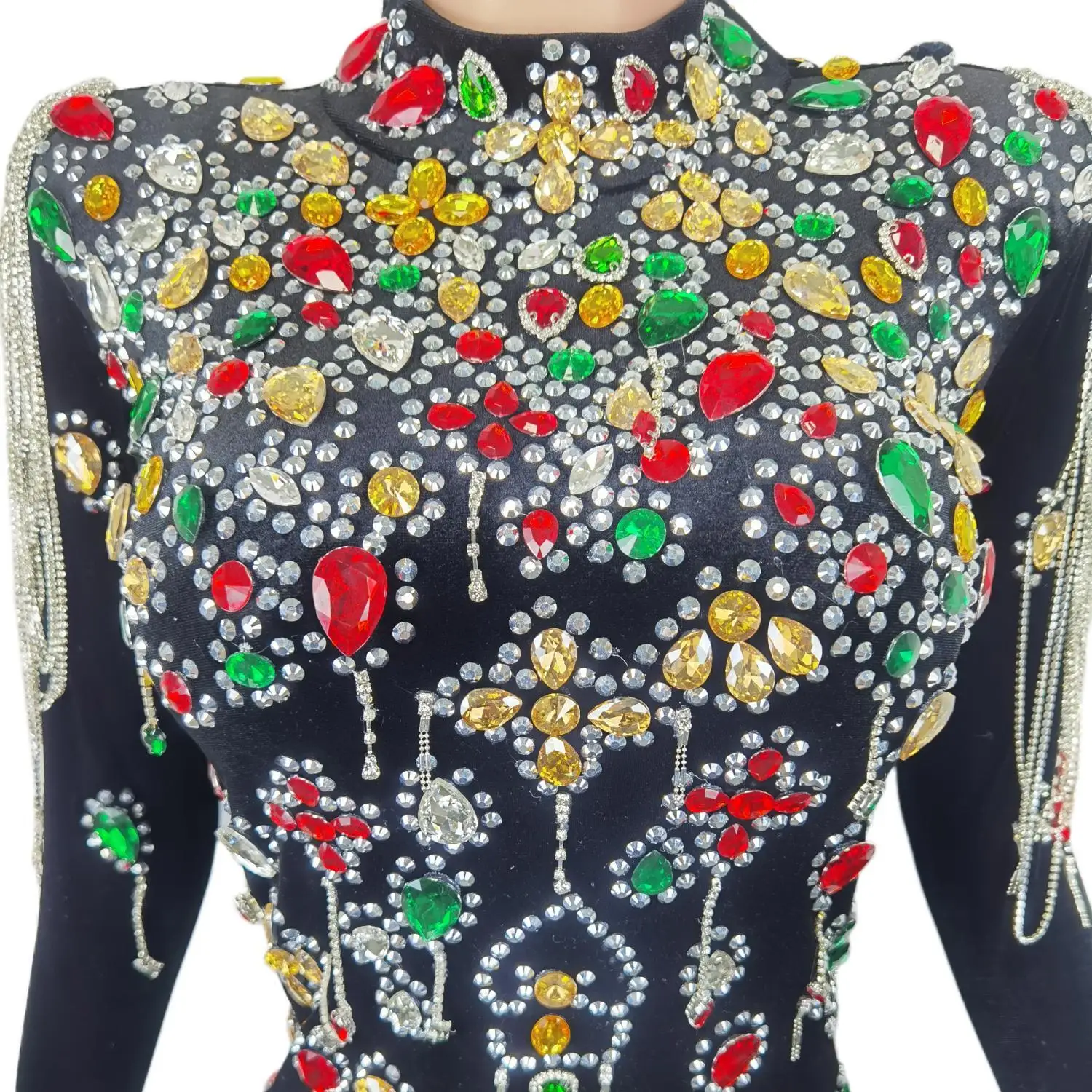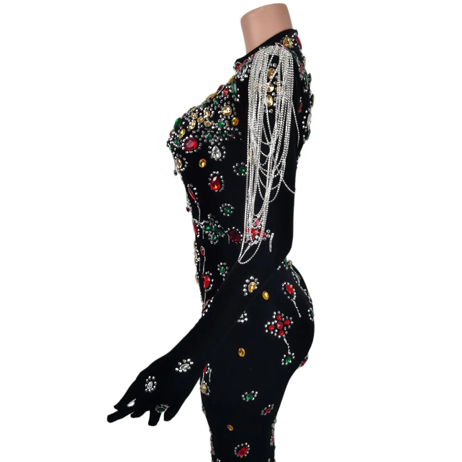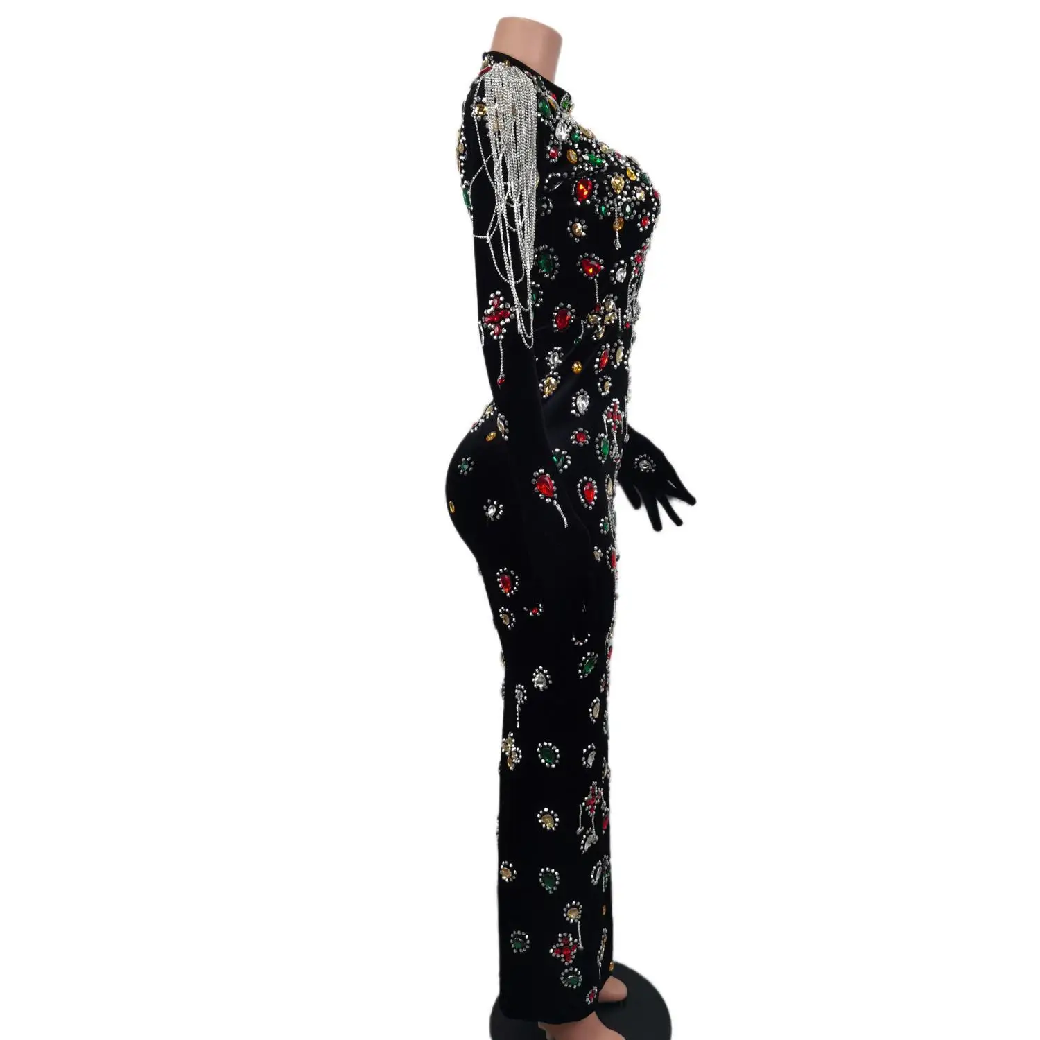 Brand Design Colorful Stones Black Velvet Dress Evening Sexy Crystals Chains Dance Costume Birthday Gloves Dress Caihongtang