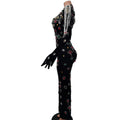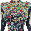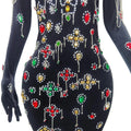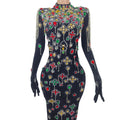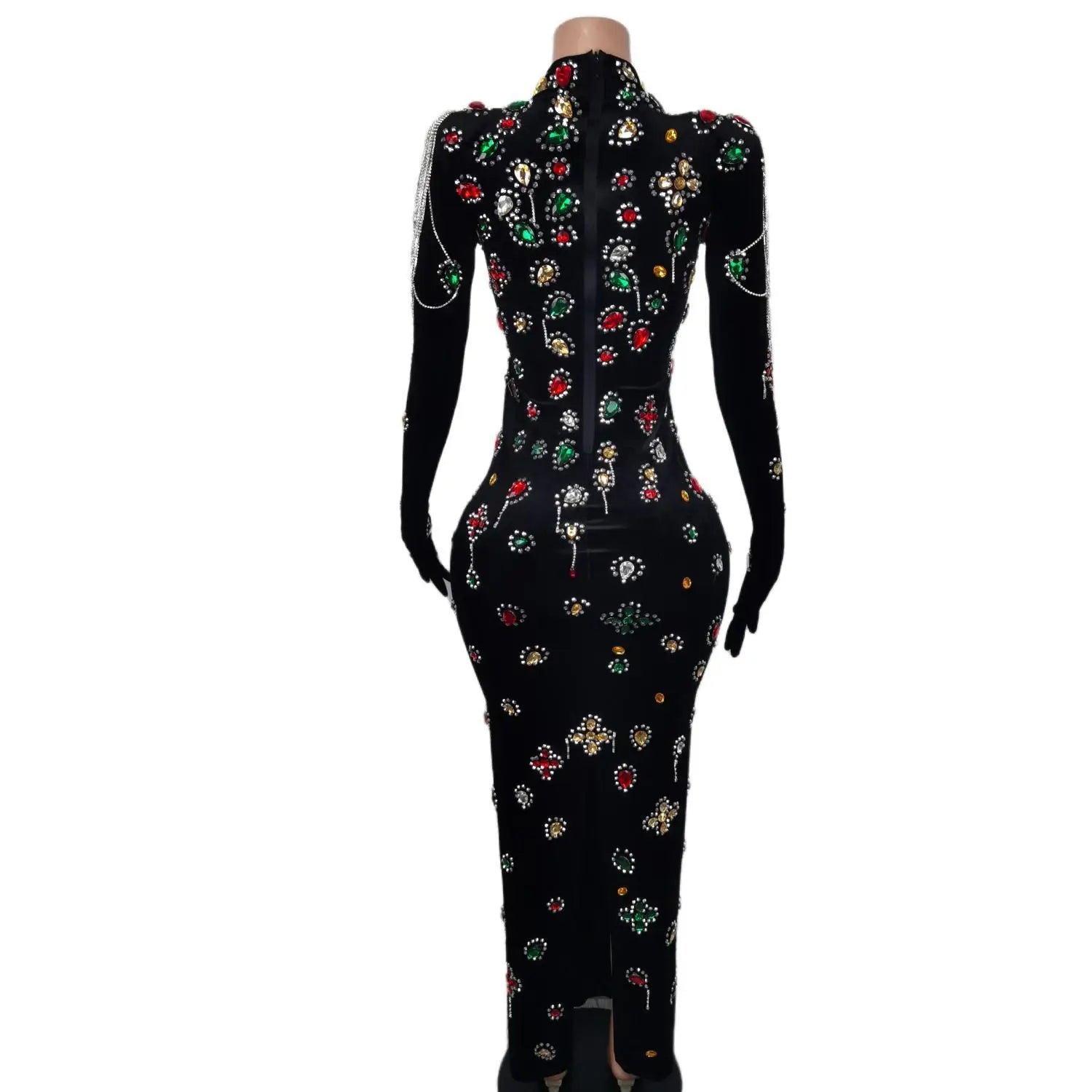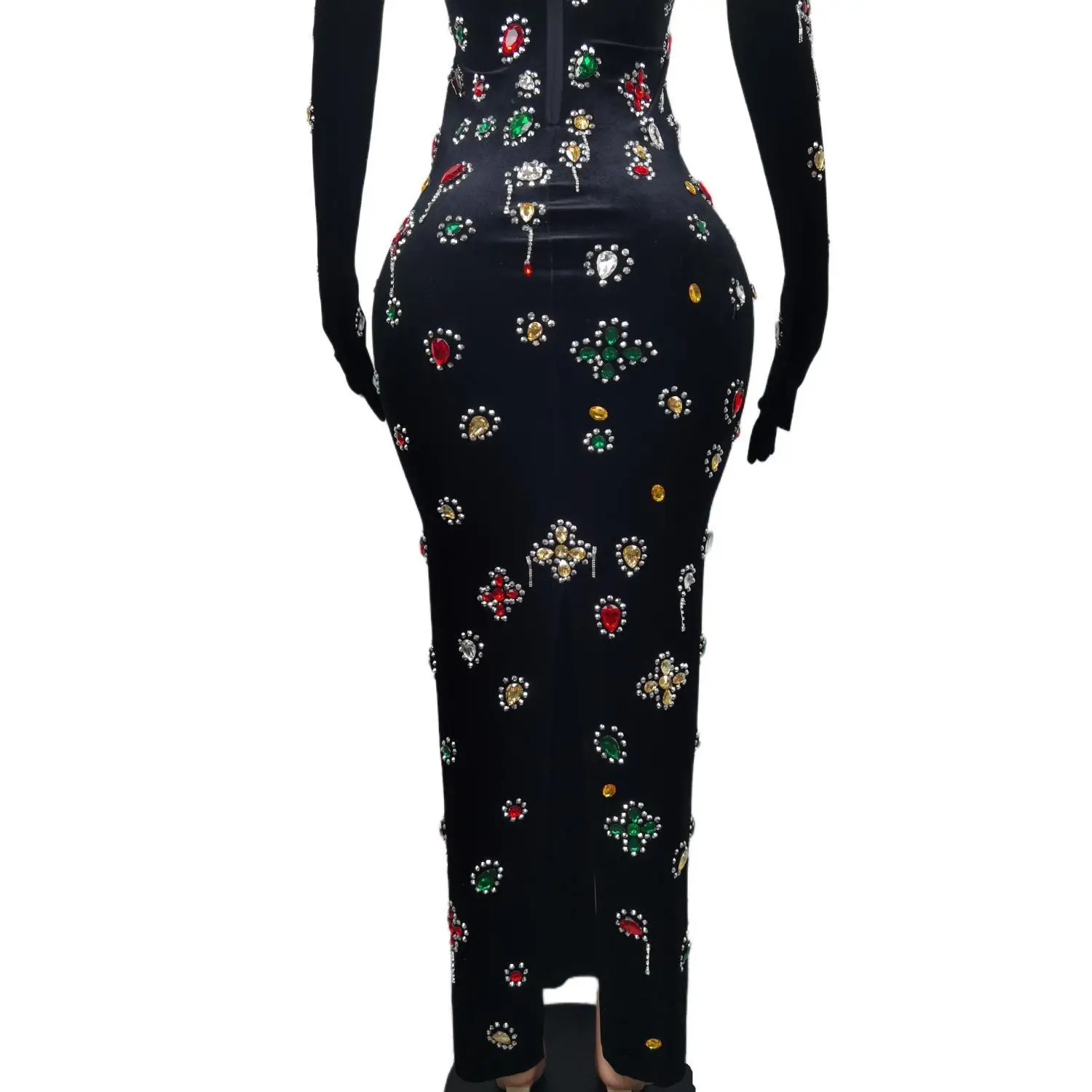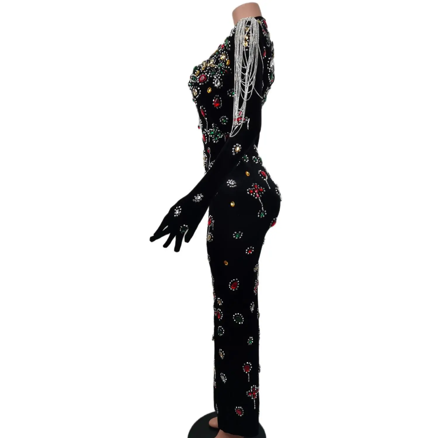 Glamorous Black Velvet Evening Dress with Vibrant Crystal Embellishments & Elegant Gloves