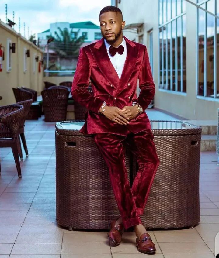This burgundy velvet groom wedding tuxedo is designed for men's party and prom events. It includes pants and a coat, making it suitable for business wear and formal outfits