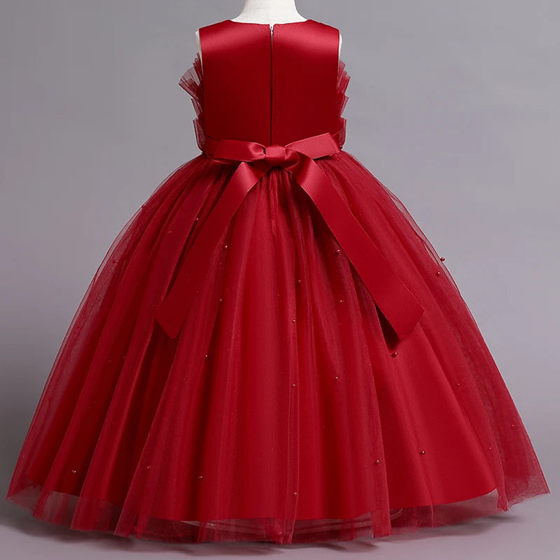 Girls Sleeveless Tulle Beaded Ball Gown Dress Red