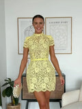 Chic Butter Yellow Lace Print Mini Dress Women's Elegant Short Sleeve O-neck High Waist Gowns Lady Holidays Street Vestidos