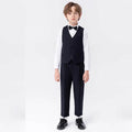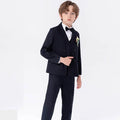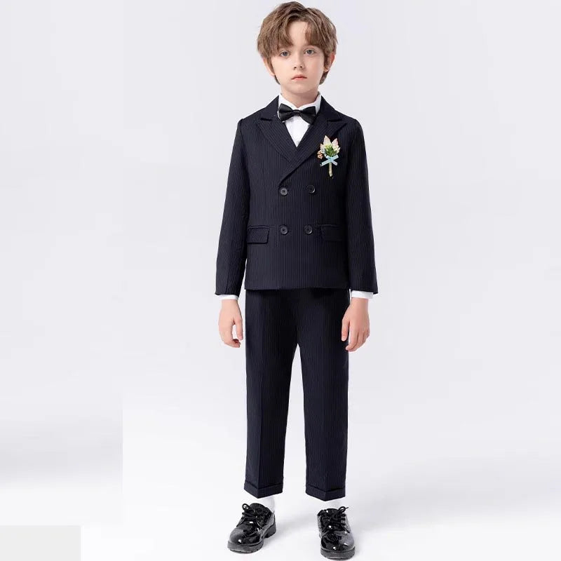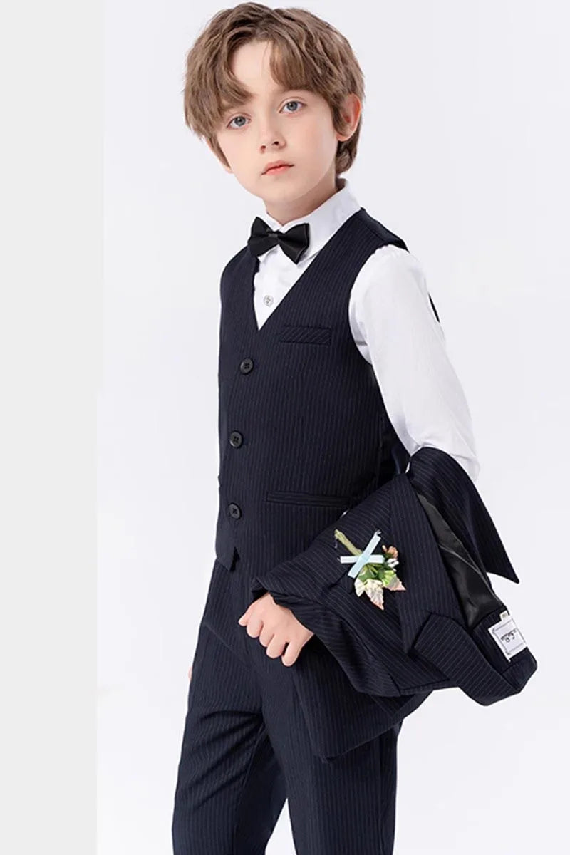 Boys Classic Black Pinstripe Formal Suit with Bow Tie and Boutonniere